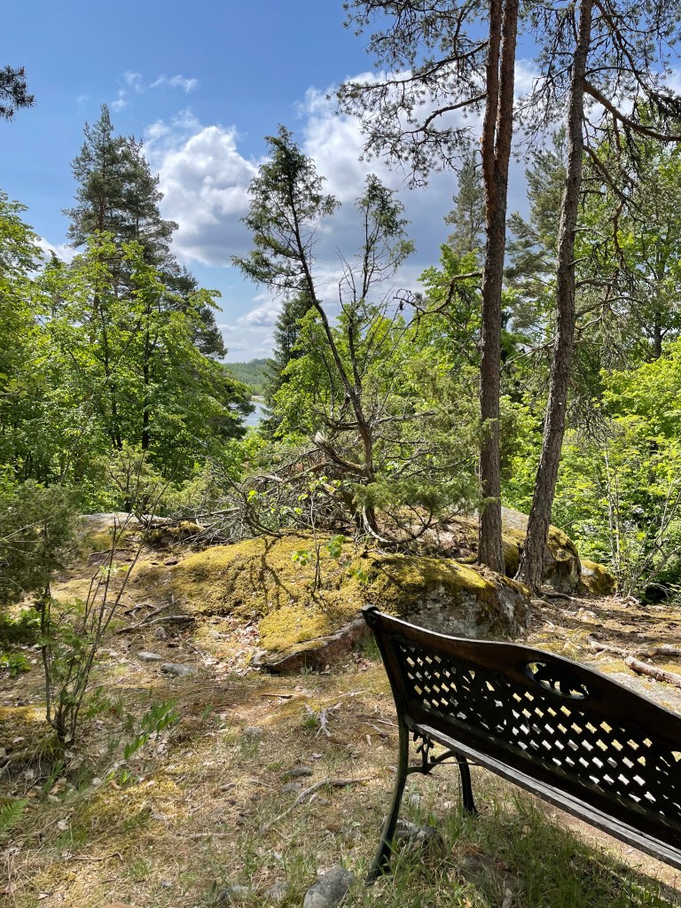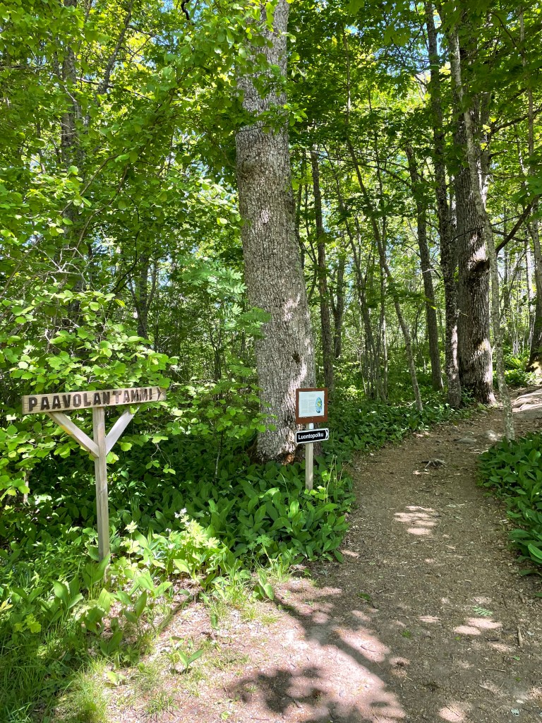 Kävin tutustumassa Paavolan tammeen kesällä 2023 ja kaikki oli ihanan vehreää. Polun varrella oli luontopolun kylttejä, joihin yhteen oli laskeutunut kaunis nastakehrääjä. Yhdellä kalliolla oli myös kutsuva penkki, joka oli siellä näköalan, tauon, eväiden tai ihan vaan nautiskelun ja mietiskelyn takia.