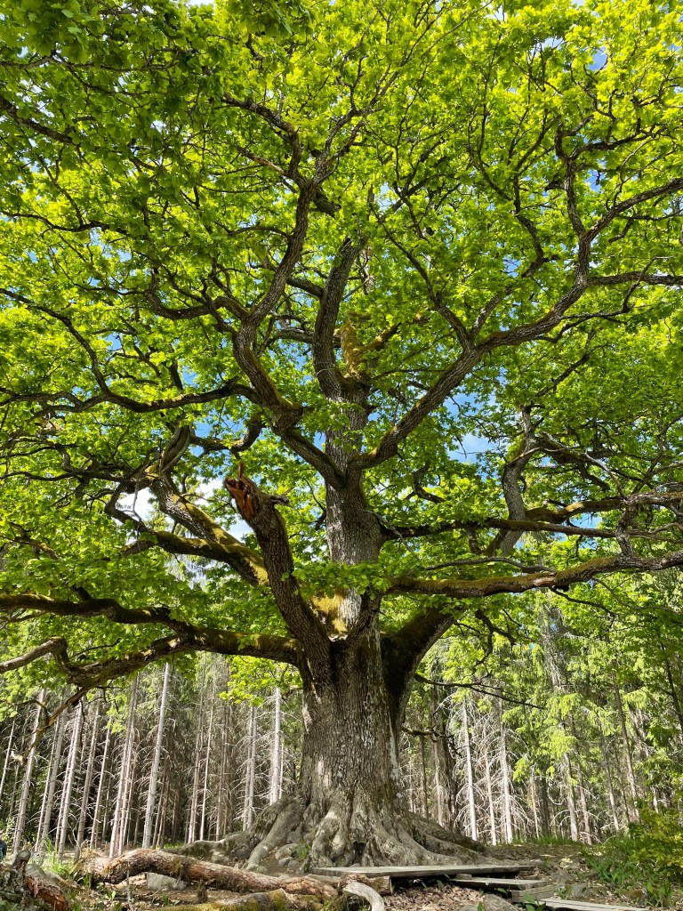 Paavolan tammi on todella upea ilmestys. Tuntui jopa, että siinä on jotain pyhää. Teki mieli tarkastella sitä jokaisesta kulmasta ja tuijotella sitä ajan kanssa. Tuijottelin sitä kauempaa ja lähempää ja otin kuvia sieltä täältä. Paksut juuret kutsuivat istahtamaan tammen siimekseen, mutta kieltomerkki oli paikallaan. Puun juurille ei saa astua, eikä istua, sillä isot kävijämäärät voivat vahingoittaa ainutlaatuista puuta.