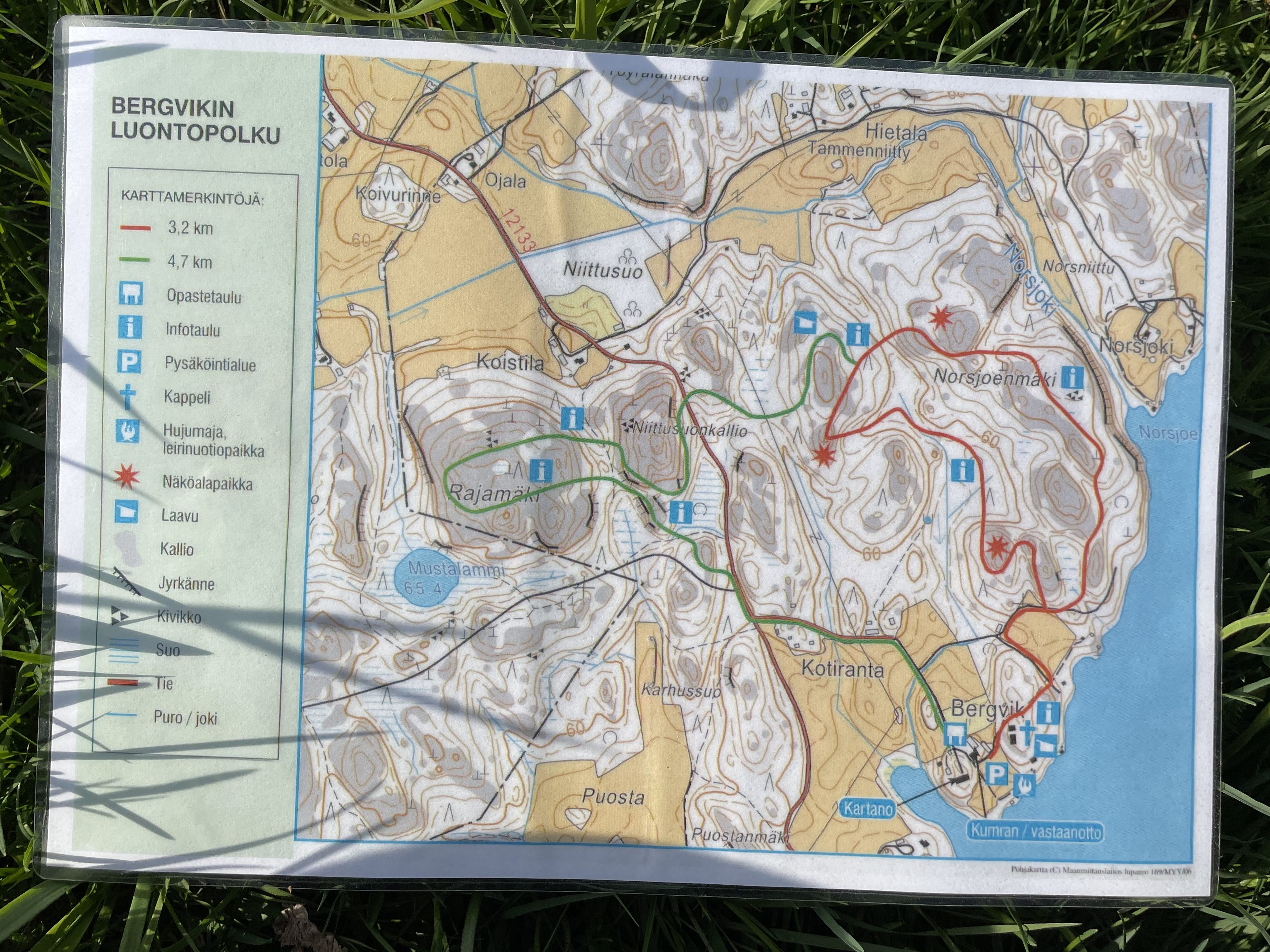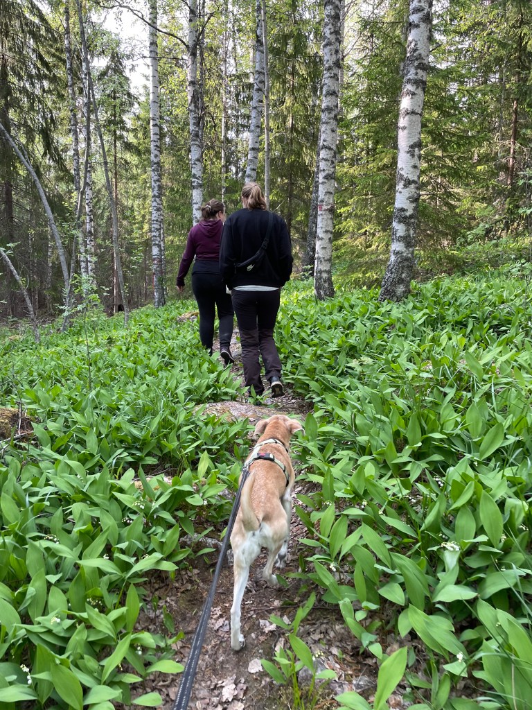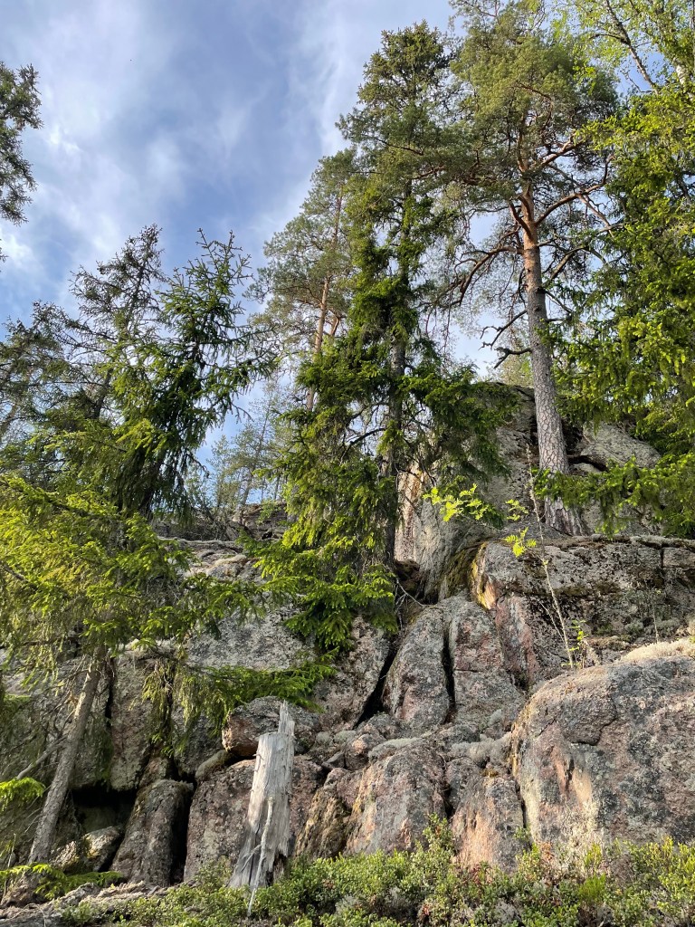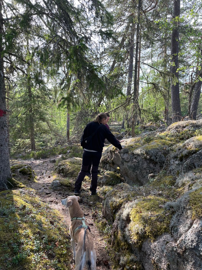 Saapuessamme paikalle, ketään ei ollut missään. Kartanolle saavuttaessa parkkipaikka on vasemmalla puolella ja parkkipaikan yhteydessä on viitta luontopolulle ja postilaatikossa kartta. Lähdimme alkuun punaisella merkitylle luontopolulle, joka kulki alkumatkan pellon reunaa kulkevaa tietä pitkin. Metsätyyppejä ja maisemia oli todella paljon erilaisia, välillä tosin myös tylsää hakkuuaukeaa. Pidimme pienen tauon laavulla ja jatkoimme matkaa alas vihreää reittiä. Polku kulki jonkun matkaa metsäautotietä ja ylitti autotien. Sitten kadotimme hakkuualueella polun ja etsimme jonkun polun Karttaselain -sovelluksen avulla. Suunnat menivät hieman sekaisin ja kiertelimme omiamme, mutta löysimme jäkälän peitossa olevan näköalakallion, joka kuului reittiin. Reitin loppuosan varrella oli tosi hienoja kivenlohkareita ja maisemasta ylös hyppääviä kallioita.