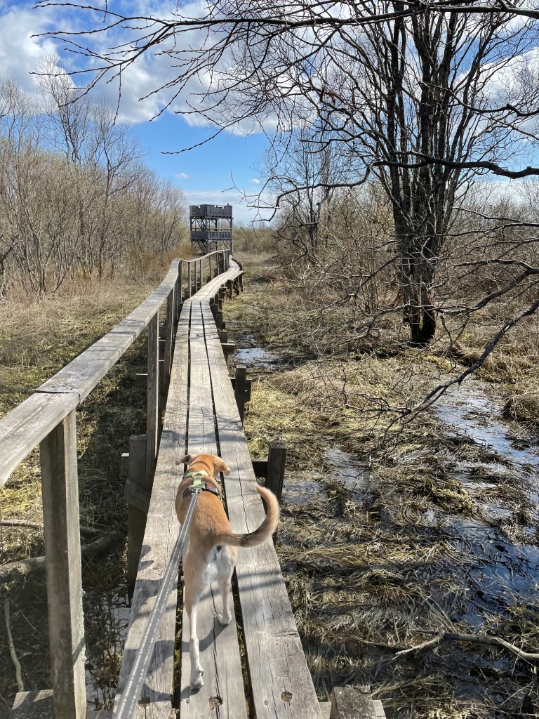 Parkkipaikka oli ison tien varressa ja se ei antanut kauheasti odotuksia ainakaan hiljaisuudesta. Parkkiksella oli erilaisia opastauluja ja niitä hetken lueskeltuani lähdin ensin lyhyehkölle, noin kilometrin mittaiselle luontopolulle. Polku alkaa heti pitkospuilla kohti kaislikkoa ja lyhyen kävelyn jälkeen tulee vastaan lintutorni. Pitkokset muuttuivat hassuiksi korkopitkoksiksi, koska ne kulkivat ylhäällä kuin Linnanmäen monoraili. Kahden koiran kanssa jännitin, tuleeko joku vastaan, mutta muutaman kulkijan ohitus sujui onneksi odottelemalla sopivilla paikoilla. Jännien pitkoksien jälkeen tulin pellon laitaan ja lähdin seuraamaan pellon laitaa oikealle, jonne ei mennyt mitään maailman selvintä reittiä. Hetken kuljeskeltuani näin suloisen piilokojun. En ole ehkä näin söpöä kojua nähnyt missään. Koirilla ei hermo kestänyt kopissa istuskelua pidemmässä mittakaavassa, joten tyydyin lintujen tarkkailun sijaan nauttimaan hetken pienessä pesässä istuskelusta. Sen jälkeen palasin pellon laitaa takaisin ja ennen kuin sukelsin takaisin kaislikkoon ja pitkospuille, kävin pellolla sijaitsevan ladon luona, joka oli nyt kiinni. Lato esittelee erilaisia maatalouslaitteita ja niitä tirkistelin lautojen raoista.