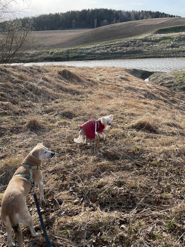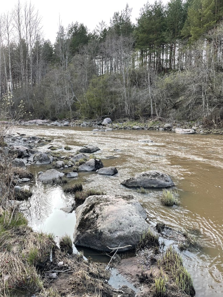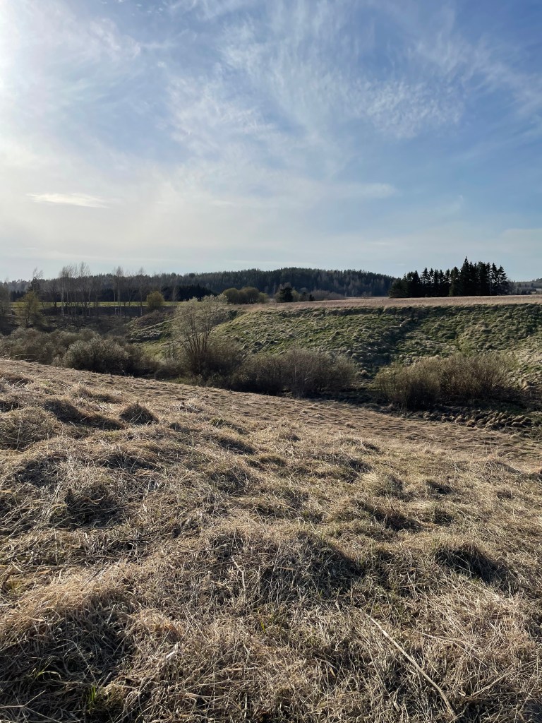 Harvoin moitin mitään kohdetta, mutta tämän paikan kanssa teen poikkeuksen. Lähdin tutustumaan paikkaan toukokuisena kevätiltana 2022 Etelä-Suomen Retkeilyoppaan innoittamana. Jätin auton tehdasalueen parkkipaikalle ja lähdin etsimään polun päätä. Sitä en löytänyt, vaan lähdin olettamaani suuntaan ja löysin jonkun polun tapaisen. Polun oli tarkoitus kulkea alhaalla puronuomassa, mutta kulku siellä oli mahdotonta kaadettujen kuusien takia. Päädyin kulkemaan pellon reunaa.
