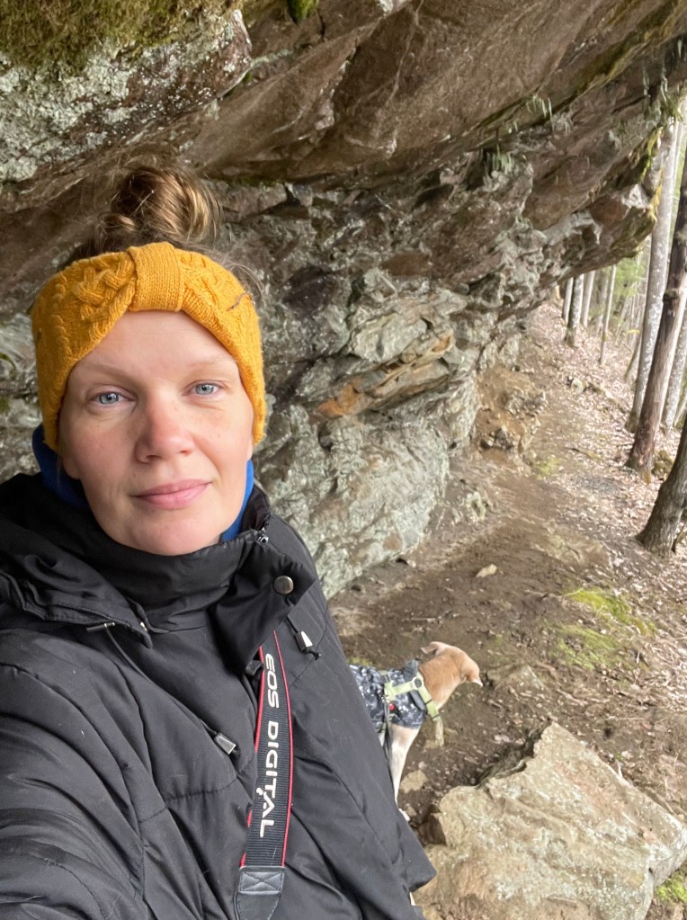 Aikani taisteltua lippa oli kartan mukaan lähellä. Lähdin kiipeämään rinteeseen, joka oli oma taiteenlajinsa kahden koiran kanssa. Viimein saavuin lipalle ja jo toivottomalta tuntuneen rämpimisen takia paikka tuntui erityiseltä saavutukselta. Lippa on valtava ja vaikuttava. Lipan alla mahtuu hyvin seisomaan ja se on pitkänmallinen, joten kävelet ikäänkuin katoksessa.