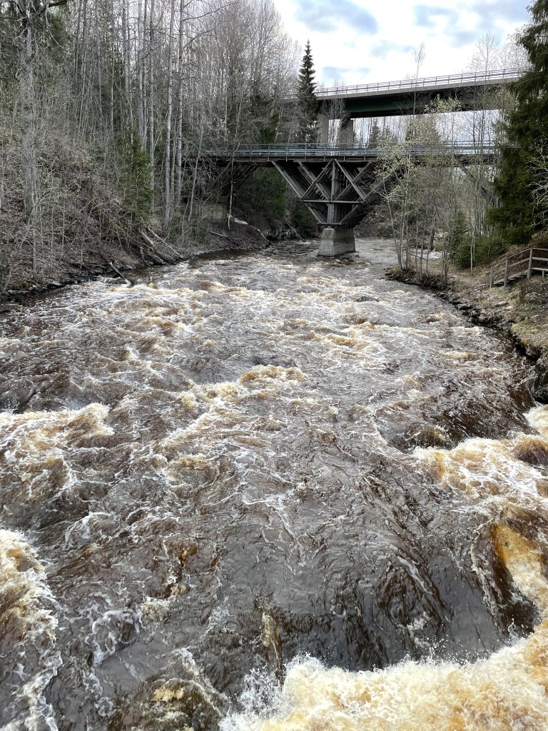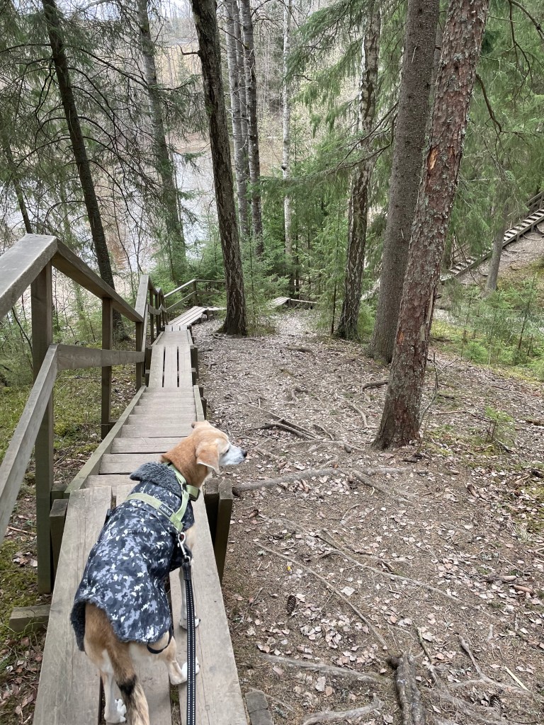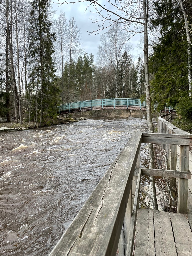 Pitkospuut, portaat ja kaiteet tekivät paikasta jotenkin erityisen kivan kulkea. Lähdin seuraamaan kosken reunaa kulkevia pitkospuita innostuneena pidemmälle ja reitti paljastuikin Seitsemän veljeksen vaellusreitiksi. Saavuin jollekin sillalle ja käännyin siellä takaisin, sillä reitin maisemat näyttivät muuttuvan urbaaneimmaksi.