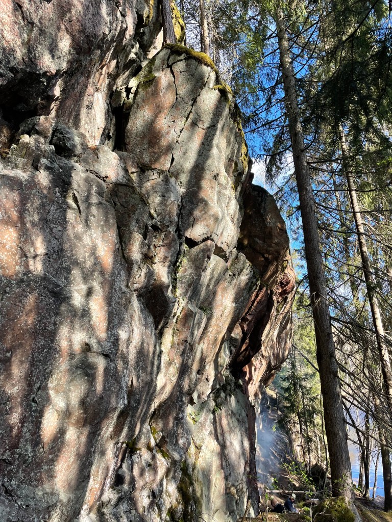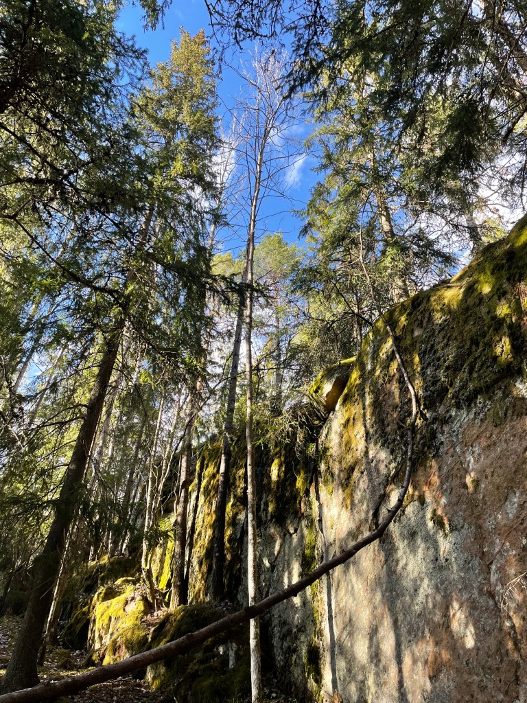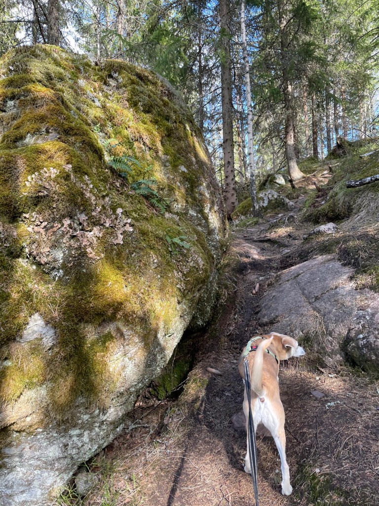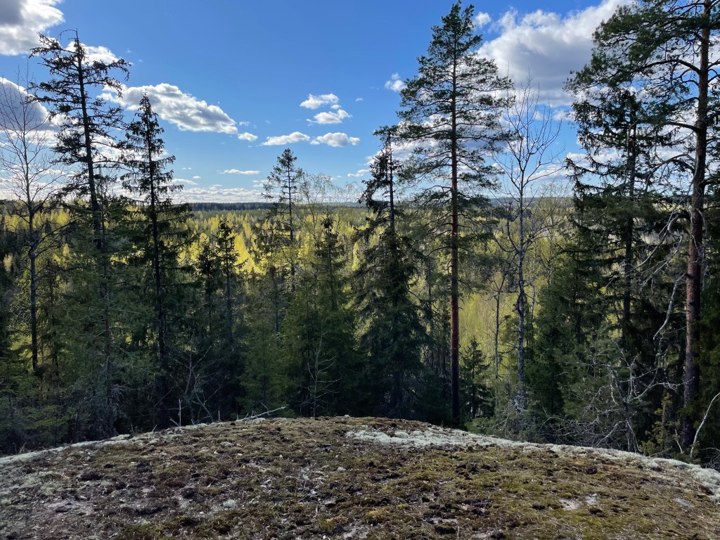 Sontiaisen uimarannalta vasemmalle vievä polku olikin melkoinen seikkailu. Polku nousi täälläkin korkean kallion päälle ja maasto ja maisema oli hienoa. Polku oli kaunis ja vei kohti Ruuhilampea. Täältä löytyivät mielestäni paikan hienoimmat kohdat. Upeat jyrkät kalliot ja kalliolohkareet viettivät alas Ruuhilammelle, jossa oli porukkaa grillaamassa. Jos olisin ollut yksin, olisin jäänyt ihailemaan paikkaa vielä pidemmäksikin aikaa. Rannassa olijoilta kyselin, mihin reitti jatkuu, mutta he eivät olleet ihan varmoja. Jonkunlainen kiipeily piti kuitenkin suorittaa, jotta pääsi rannasta pois. Toinen vaihtoehto olisi ollut kääntyä takaisin. Luotin kuitenkin kirjan kartan ympyräreittiin ja lähdin rämpimään ylöspäin. Jossain vaiheessa luulin olevani reitillä, tai nähneeni reittimerkkejä, mutta ei ollut olemassa mitään selkeää polkua. Alueella oli myös kaadettu metsää, joten eteneminen oli lievästi sanottuna vaivalloista. Jouduin käyttämään puhelinta, jotta löysin alueelta pois. Lähestyessäni Sontiaista löysin taas vahvat polut ja palasin niitä pitkin takaisin. Jos olisi ollut enemmän aikaa, olisin lähtenyt seuraamaan näitä polkuja ja selvittänyt, mihin ne vievät. Ehkä joku toinen kerta!