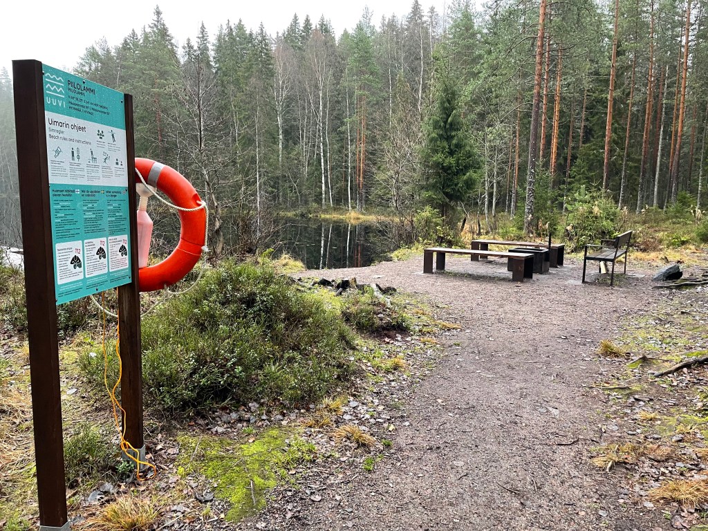 Piilolampi lepäsi hiljaisena, rauhallisena ja täysin tyynenä korkeiden kallioiden sylissä. Laskeuduin korkeammalta alas lammen rantaan kulkevalle polulle, joka johti etelärannalle, jossa oli nuotiopaikka ja hyvä hiekkaranta uimiselle. Pidin rannalla pienen tauon ja lähdin kiertämään läntistä laitaa ylöspäin. Kävin hakemassa jonkun geokätkön kallioiden päältä ja sinne olikin aikamoinen kipuaminen. En kiertänyt Piilolampea kokonaan rantoja pitkin, vaan lähdin luoteesta seuraamaan muita polkuja.