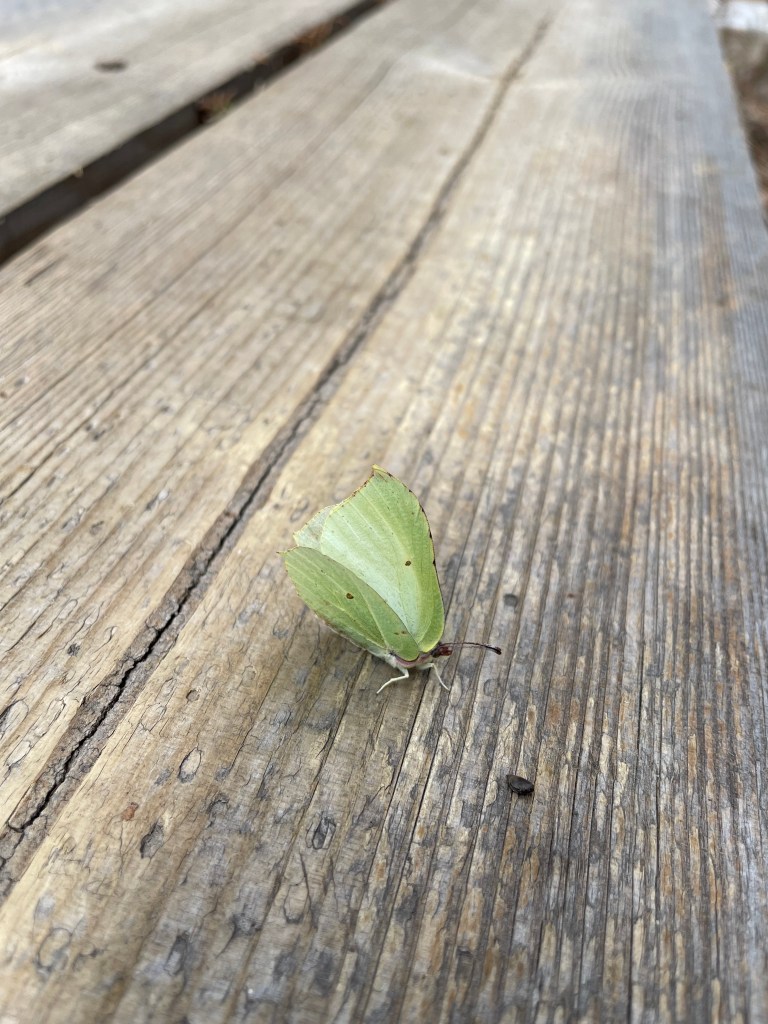 Sitruunaperhonen pitkospuilla jonkun ihmeen papanan vieressä.