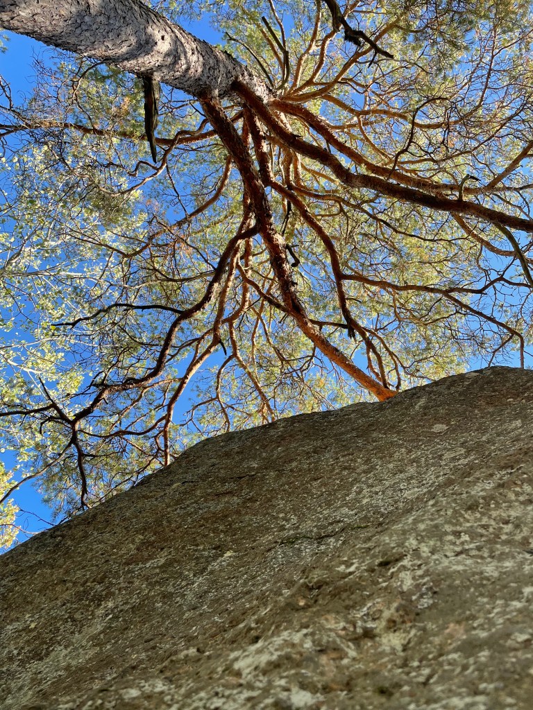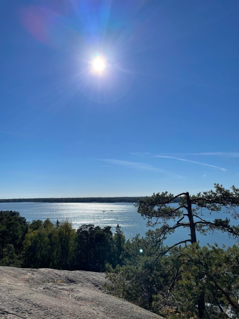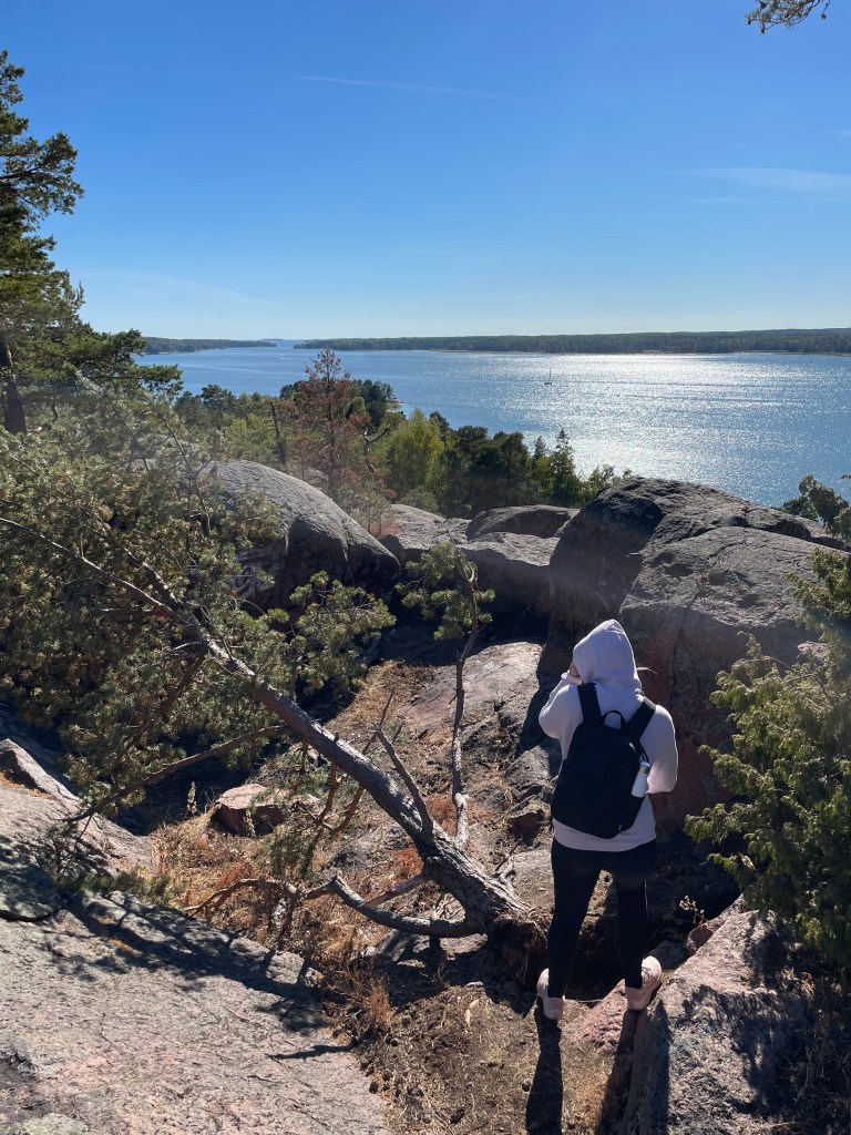Lintutornilta reitti jatkui kohti länttä pitkospuuosuuksin. Aurinko siivilöityi lehtien välistä tehden täydellisen lämpötilan reitille. Tien ylityksen jälkeen matka suuntautui kohti Kasavuorta. Suorinta reittiä Kasavuorelle emme löytäneet, vaan risteilimme hetken ulkoilureiteillä. Viimein kiipesimme kohti korkeinta nyppylää ja avautuva maisema oli leuat loksauttava. En todellakaan odottanut näin upeaa paikkaa, josta näkymät avautuivat pitkälle merelle. Söimme eväät ja makasimme kalliolla nauttimassa vuoden viimeisistä lämpimistä päivistä. Elämää parhaimmillaan.