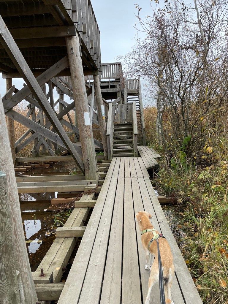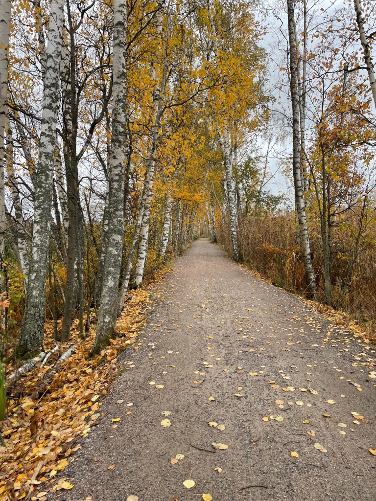 Pitkokset muuttuvat jossakin vaiheessa ulkoilureitiksi ja pian ollaankin Otaniemen päädyn lintutornilla, joka on massiivinen kaksoistorni. Valitettavasti omalla reissullani ei ollut kiikareita mukana, joten päädyin tornissa ollessani vain katselemaan maisemia ja syömään eväitä. Lahdella on pesinyt viime vuosina noin 300 paria vesilintuja, joista tavallisimmat lajit ovat silkkiuikku, haapana ja sinisorsa. Ulkoilureitti jatkuu vielä koivujen reunustamaa suoraa tietä kohti Otaniemeä. Kävelin niin pitkälle, kunnes kadut tulivat vastaan ja käännyin takaisin palatakseni samaa reittiä kohti Villa Elfvikiä.