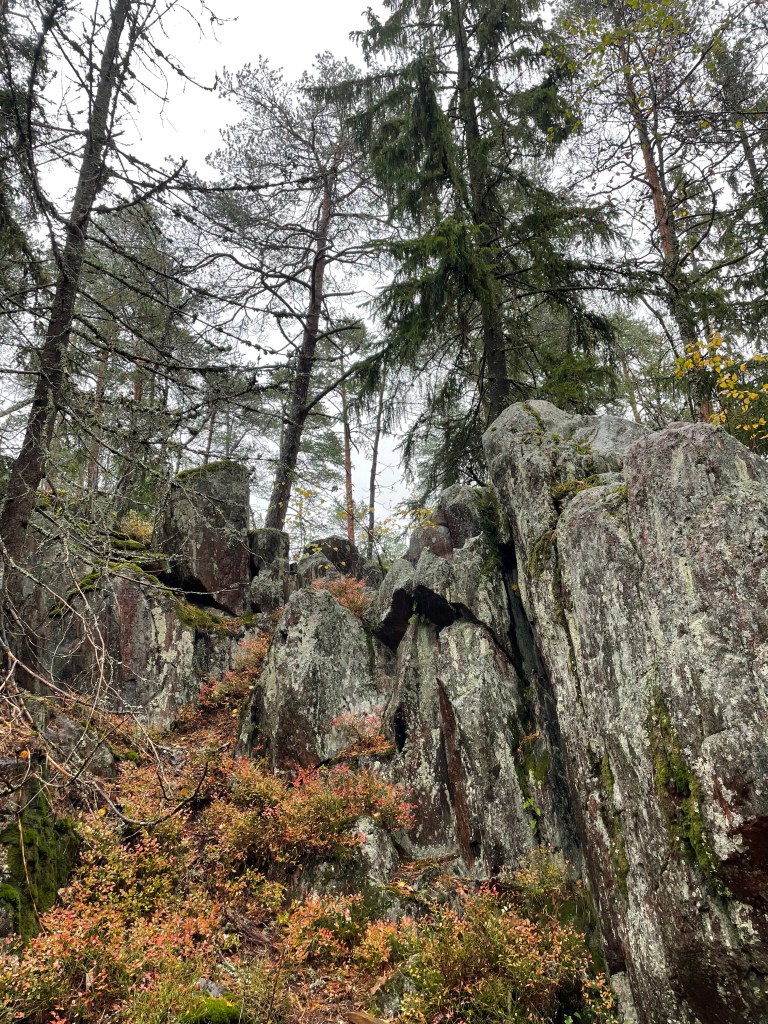 Vaikka sää ei ollut alkuun parhain mahdollinen, vaihtui se kuitenkin lopuksi auringon pilkahduksiin. Kuljeskelin alueella yli kolme tuntia ja ulkoilutien poikkeamat olivat parasta antia ja tarjosivat mielenkiintoisia yllätyksiä. Maasto oli mukavan monipuolista kallioiden takia ja metsät vaihtelivat männyistä lehtoihin. Arkipäivän ja epävakaisen sään takia sai alueella kuljeskella melkoisen rauhassa, mitä nyt ulkoilutiellä oli muutamia kulkijoita.