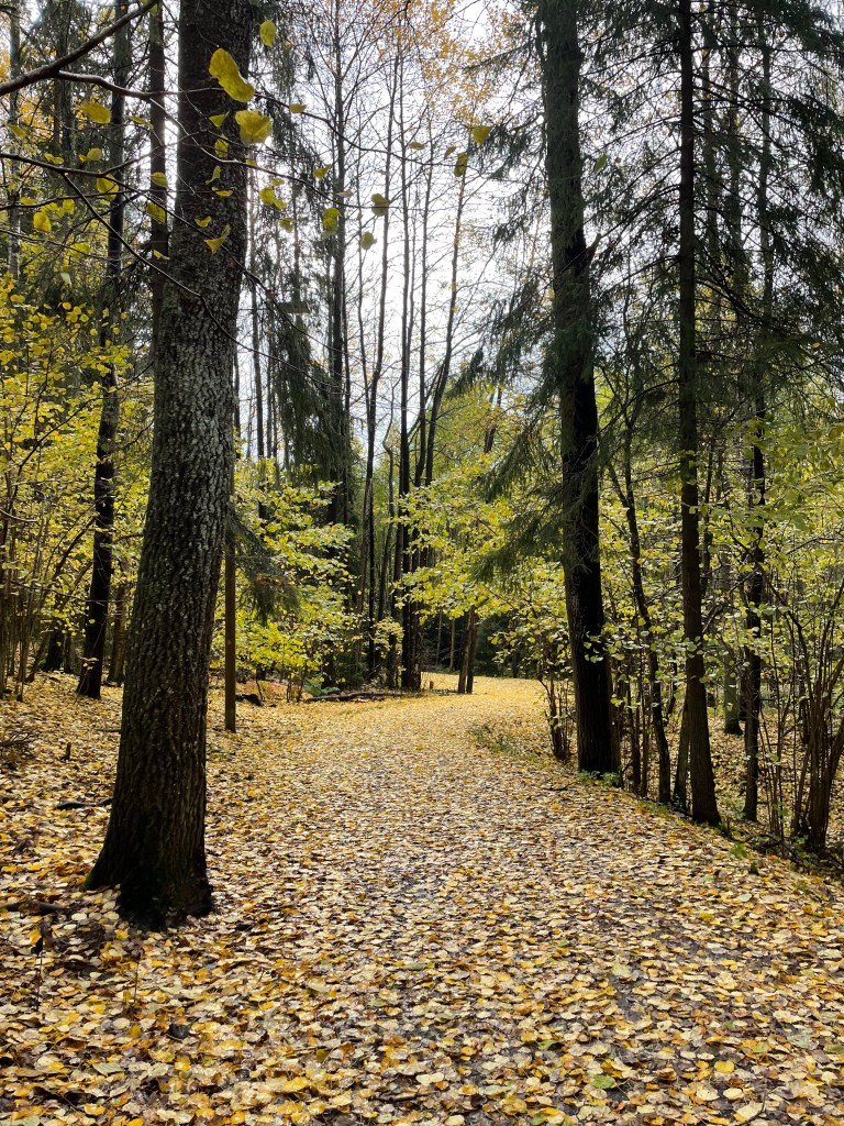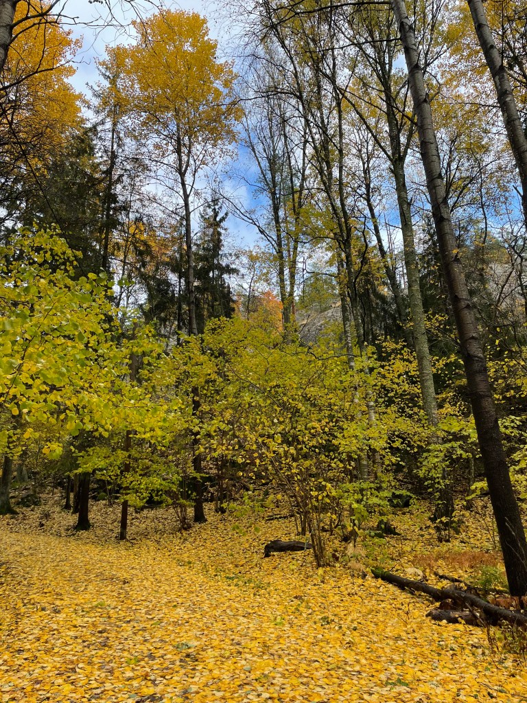 Aikani raunioilla kierreltyäni palasin takaisin ulkoilutielle ja lähdin kävelemään kohti Kasavuorta. Kasavuorelle poikkesi ulkoilureitiltä polku, joka kiipesi kohti kallion lakea. Syksyinen näkymä levittäytyi eteeni sisältäen luonnon värien lisäksi ihmisten mainosvaloja ja Turun moottoritien. Kallioalue oli mukava ja jäin sinnekin pyörimään toviksi ennen kuin laskeuduin alas kävelytielle. Tein piston alas ja lehtipuiden takia koko tie oli aivan keltainen. Aiemmassa kohdassa tie oli neulasista keltainen ja sanoisin, että tässä tapauksessa syksyn värit toivat paikkaan erityisen viehätyksen.