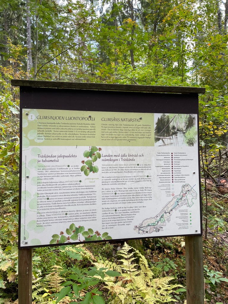 Tein lähtöä Glimsinjoen luontopolulle ainakin kolme kertaa, mutta jäin kerta toisensa jälkeen haahuilemaan vieressä sijaitsevan salaperäisen Träskändan kartanopuiston maisemiin. Yhdessä nämä kaksi kohdetta ovatkin oikein potentiaalinen kokonaisuus täydelliselle päiväretkelle. Syyskuussa 2022 oli kaunis päivä ja mieli oli seikkailullinen, joten marssin päättäväisesti läpi kartanopuiston kohti luontopolun aloituspistettä.