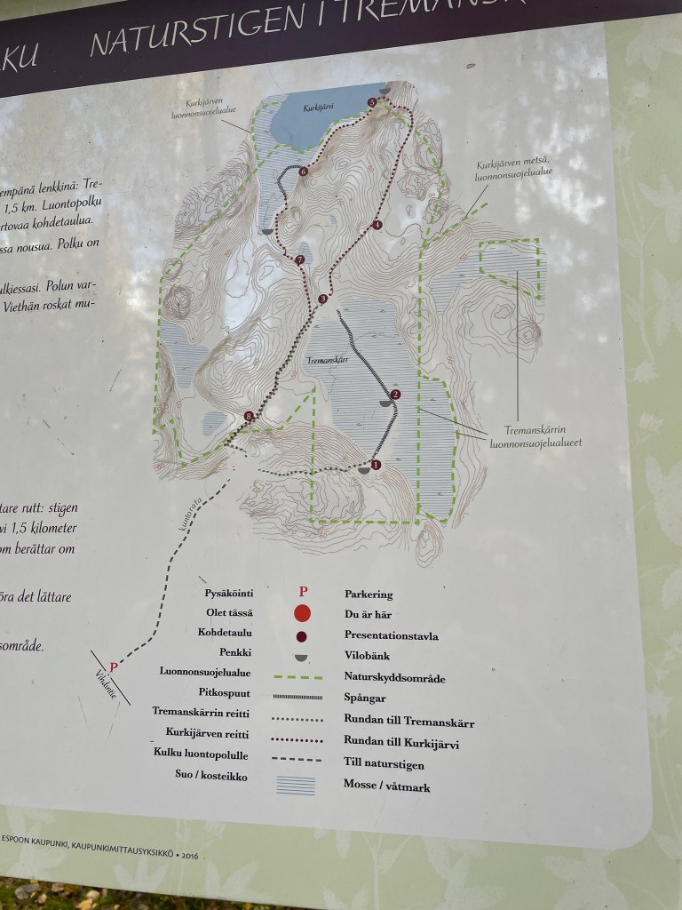 Lähdimme kaverini kanssa retkeilemään syyspäivänä 2022 ja valitsimme kohteeksi Tremanskärrin luontopolun sekä Kalajärven kallioiden luonnonsuojelualueen. Tehdään heti alkuun selväksi Tremanskärrin nimen tarina. Tarinan mukaan alueelle on isonvihan aikaan uponnut suohon kolme venäläismiestä. Totta tai tarua, joka tapauksessa suolla kävely on mahdollistunut tässäkin paikassa mallikkaasti pitkospuiden avulla, eikä suohon uppoamista tarvitse pelätä.