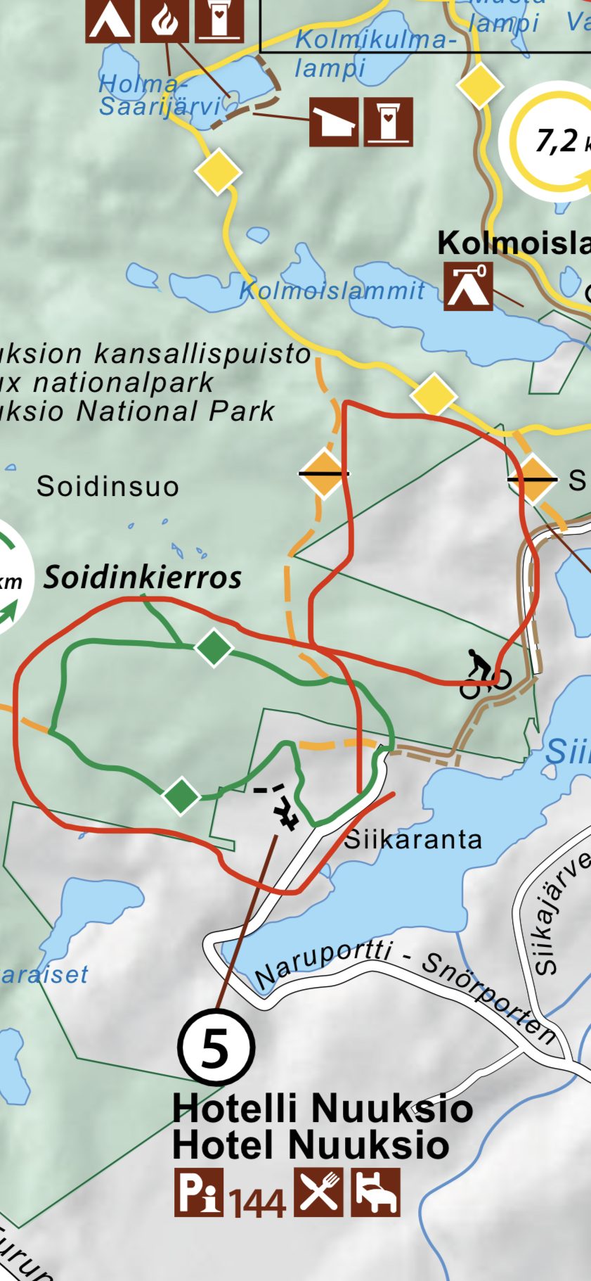 Lähtöpaikkamme oli siis Siikarannan eli Hotelli Nuuksion luona. Lähdimme kiertämään Soidinkierrosta vastapäivään, poikkesimme Soidinsuolle ja sen jälkeen tielle saapuessamme alkoi varsinainen sekoilu. Polkuja risteili paljon ja oli vaikea hahmottaa, mikä kulkee mihinkin. Lopulta yhdyspolun vinoneliömerkit löytyivät ja niitä pitkin kuljimme kohti Korpinkierrosta.