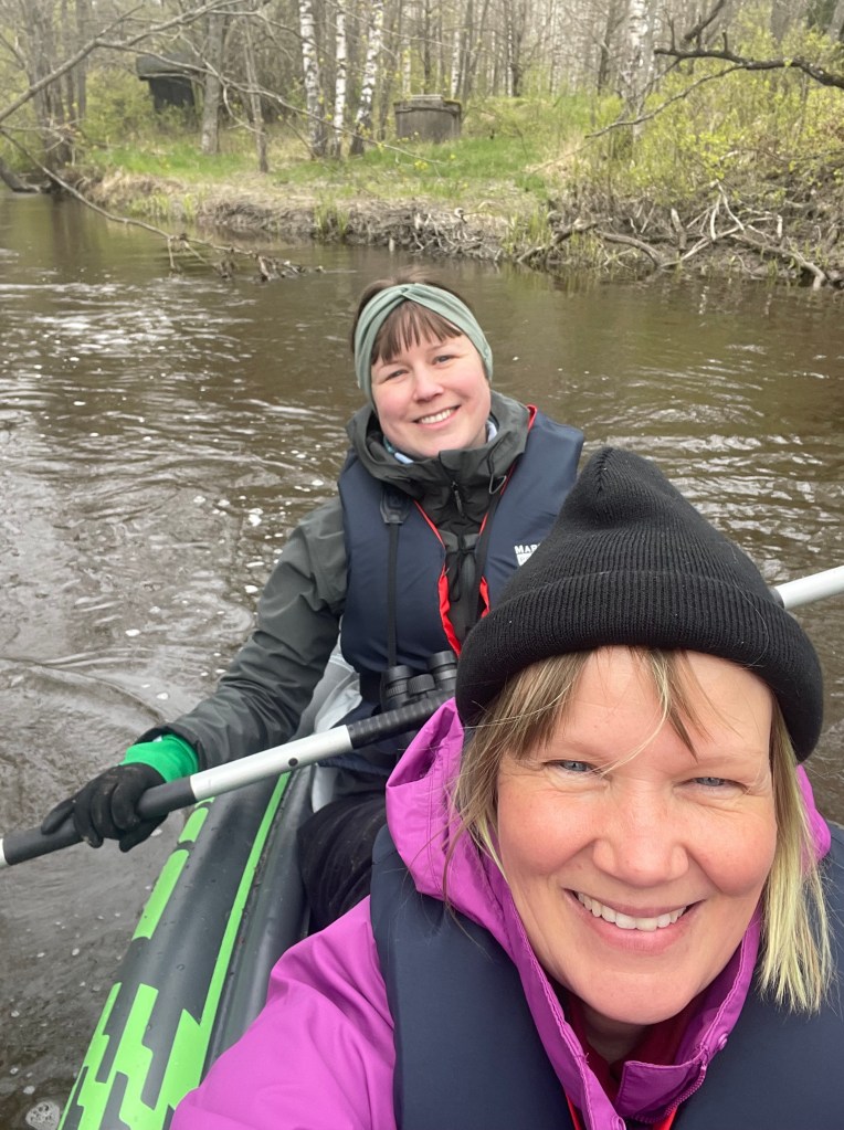 Merta lähestyessämme tulimme ensin luonnonsuojelualueelle ja maisema muuttui ruovikkoiseksi. Merenlahti aukeni eteemme ja siellä olikin hieman enemmän aaltoja ja hetkellisesti sai meloa ihan kunnolla päästäkseen eteenpäin. Etsimme Espoonjoen suuta, joka oli yllättävän hankala huomata kaislikon takaa. Näimme joutsenia, harmaahaikaran, erilaisia vesilintuja ja aiemmin joen varressa paljon laululintuja. Muut tähyilivät lintuja tornista ja tuntui etuoikeutetulta olla lintujen kanssa samassa elementissä. Espoonjokea pääsi melomaan yllättävän mukavasti vastavirtaan, eikä siellä ollut puita tiellä. Maisemat lipuivat talojen pihojen ohi, mikä sekin oli omalla tavalla mielenkiintoista katseltavaa. Rantauduimme Lasilaaksoon, josta nappasimme kaverini auton ja siirryimme takaisin lähtöpisteelle.