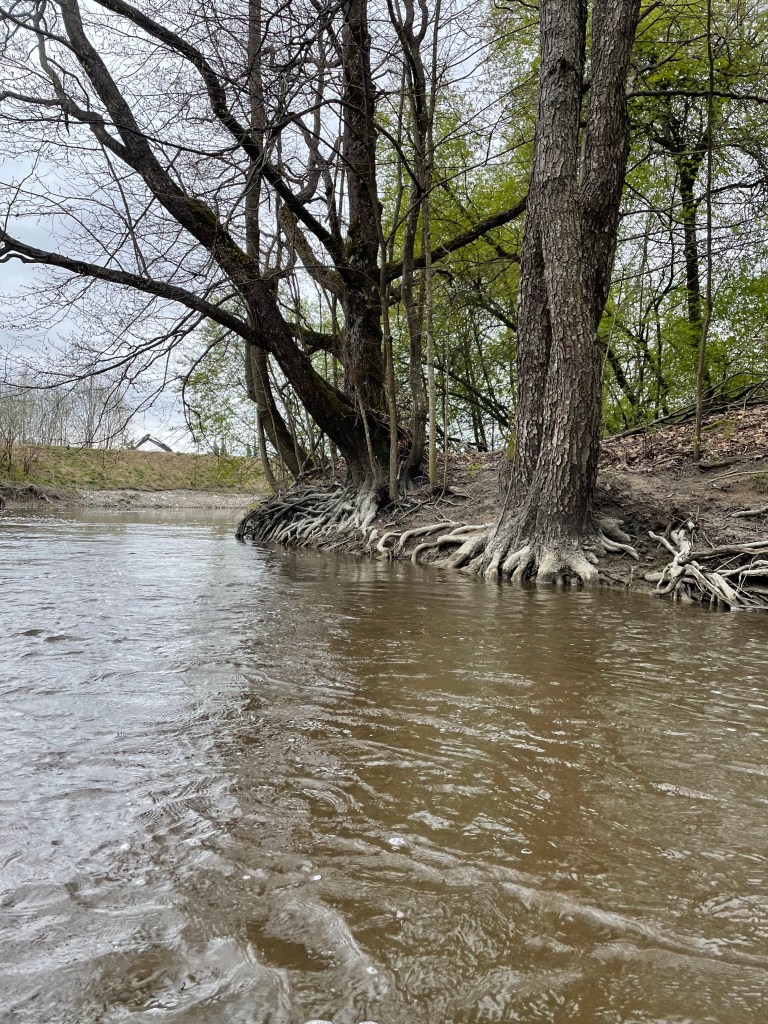 Reitti oli mielenkiintoinen, sekoitus urbaania ympäristöä ja luontoa. Jokipenger oli täynnä valkovuokkoja ja rantapuut jo vihersivät. Alhaalla sai meloa aika rauhassa, liikenteen ääntä oli tottakai paikoin ihan kuuluvastikin, mutta se ei muutamaa vilausta lukuunottamatta näkynyt. Oli hassua olla joella piilossa. Virta vei paikoin mukavasti eteenpäin ja sai vain istuskella ja nautiskella linnuista, jännistä puun juurista ja joen muuttuvista maisemista.