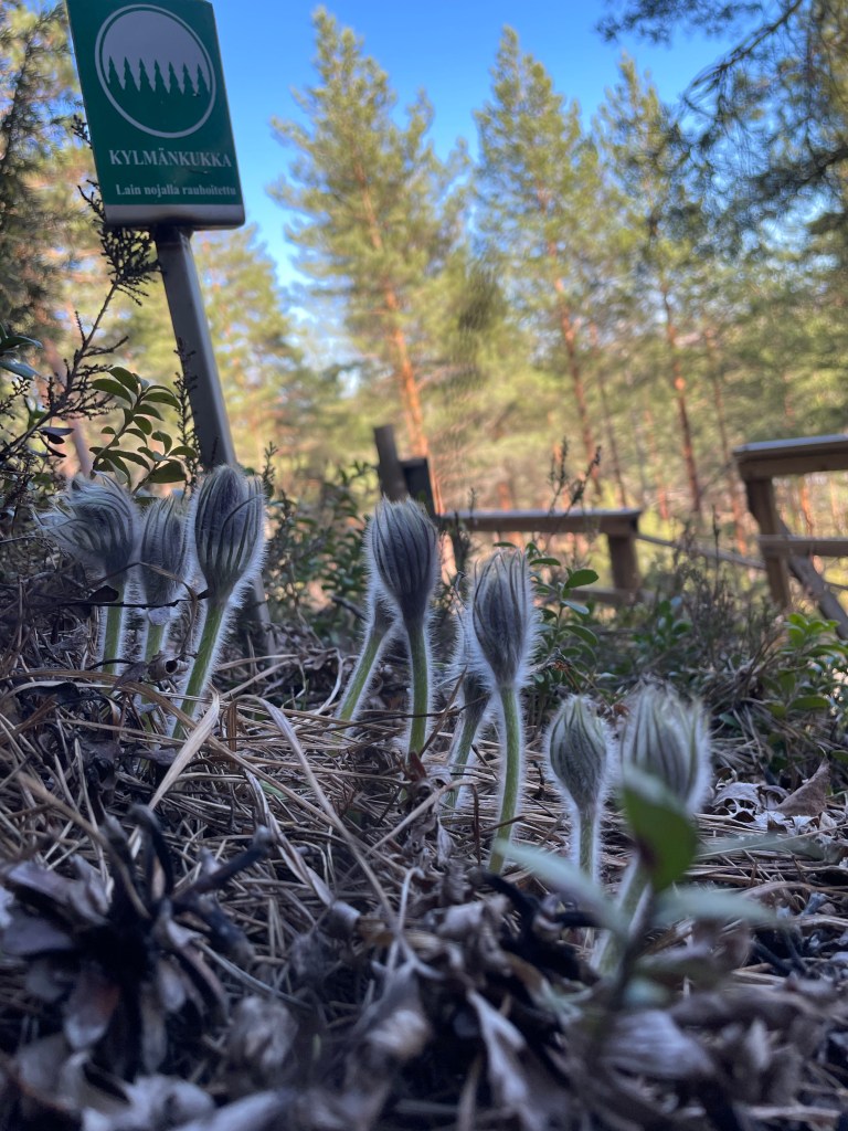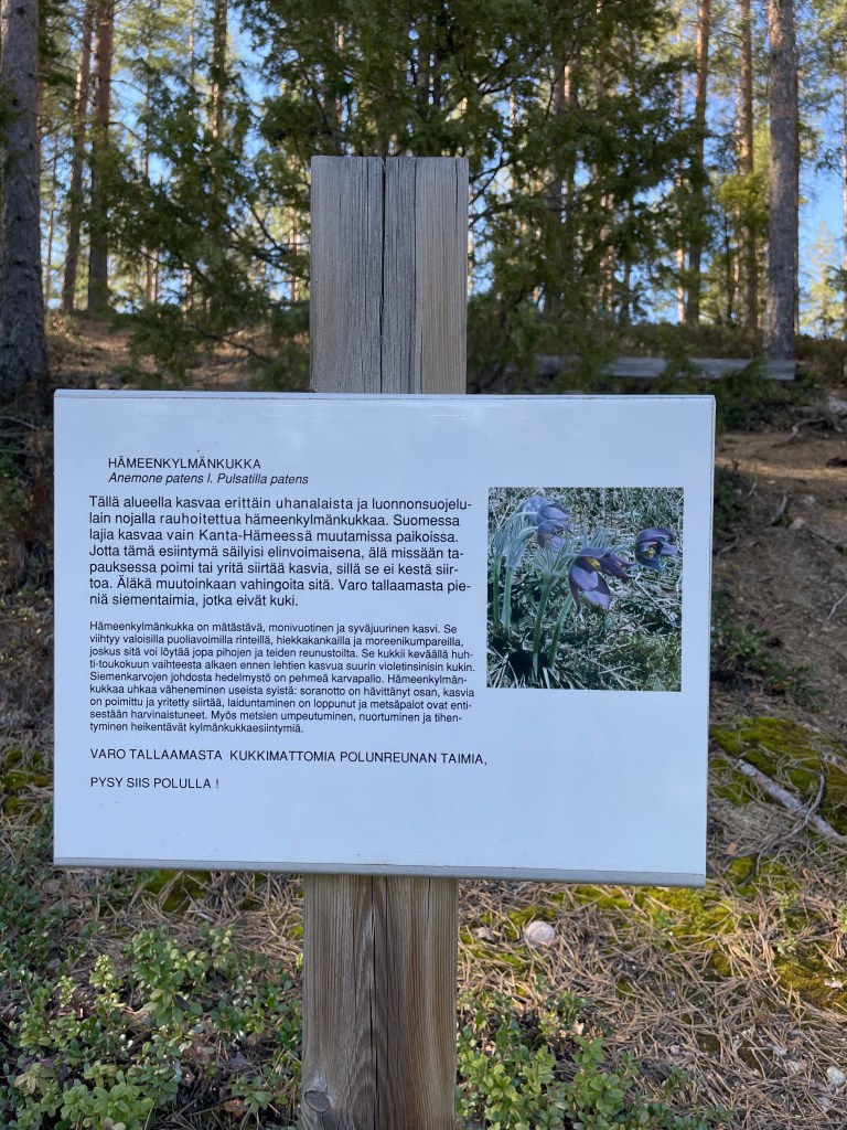 Olin aika väsynyt jo päivän kävelyistä, kun lähdin kohti Linnamäen hämeenkylmänkukkia. Matka tuntui yllättävän pitkältä, vaikka ei mäkihyppypaikalta ollut kuin ehkä kilometrin kävely (en mennyt lyhintä reittiä). Maasto oli tällä puolen harjua kuivaa ja harvaa mäntykangasta. Saavuin luonnonsuojelualueelle, joka suojelee käsitykseni mukaan juurikin hämeenkylmänkukkia. Kuljin varovasti alueen länsireunaa menevää polkua pitkin ja tähyilin maastoon, sillä luulin, että kukkia pitää etsiä. Suojelualueen yläosasta bongasin varta vasten rakennetun katselulavan ja olin hämmästynyt, että kaikki yksittäiset kukat olivat merkitty pienillä kylteillä. Niin hienoa! Kieli keskellä suuta pujottelin koiran kanssa pienillä poluilla, napsin kuvia ja pelkäsin kuollakseni tallovani jonkun yksilön. Kukat olivat vielä nupullaan, mutta ne olivat silti tosi kauniita.