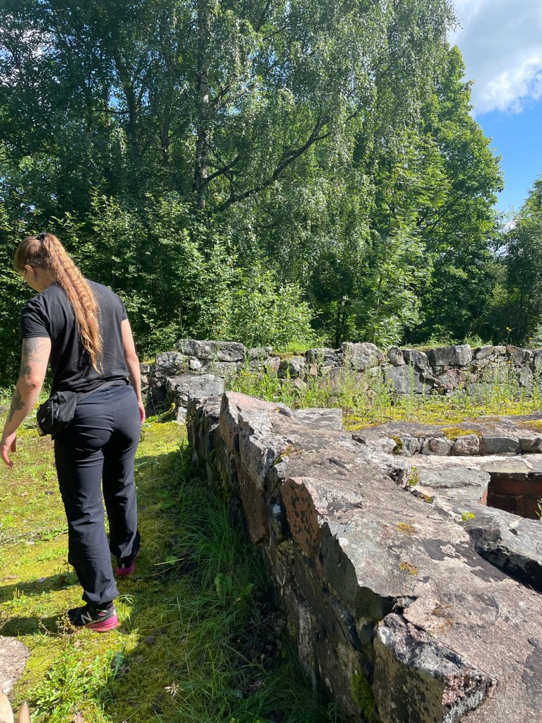 Raunioille oli kyltin ohjeistamana vain noin 50 metrin matka, mutta saimme matkaan kulumaan yllättävän kauan aikaa tutkiessamme erilaisia kasveja. Rauniot alkoivat pilkottamaan edessäpäin hylätyn näkoisen punaisen mökin jälkeen. Tutustuimme raunioihin ensin kiertämällä ne ulkoapäin ja kertasimme opaskyltistä paikan historiaa. Ensivaikutelma paikasta oli vaikuttava, koska linnanrauniot saattavat joskus olla vain muutama kasassa oleva sammaloitunut kivi. Tänne kannatti tulla.