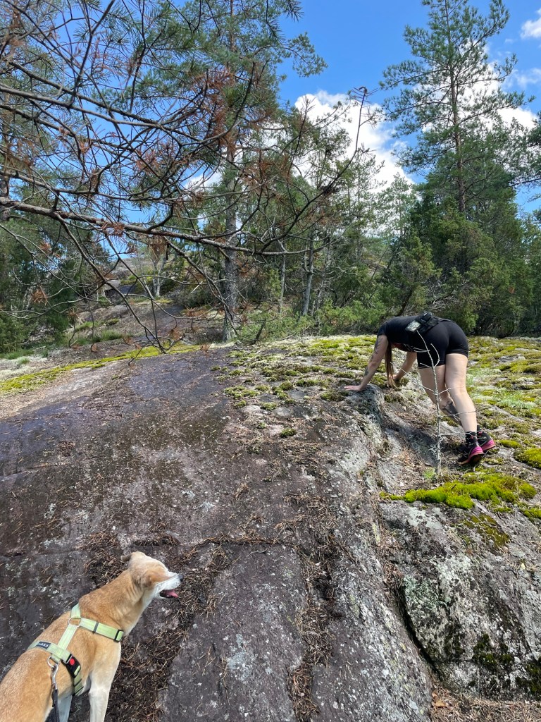 Rinne oli alkuun heinikkoinen ja polut vähän epäselviä. Suunta oli kuitenkin oikea ja pian löytyi parempi polku, joka vei kallioiden juurelle. Olin jostain lukenut, että nousu ei ole helppo ja kalliot saattavat olla sateella todella liukkaat. Varovainen sai tosiaan olla, mutta kuivalla kelillä kengistä löytyi pitoa ja ylösnousu sujui kohtuullisen helposti jopa retkikoiralta.