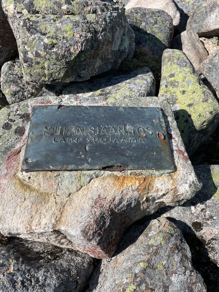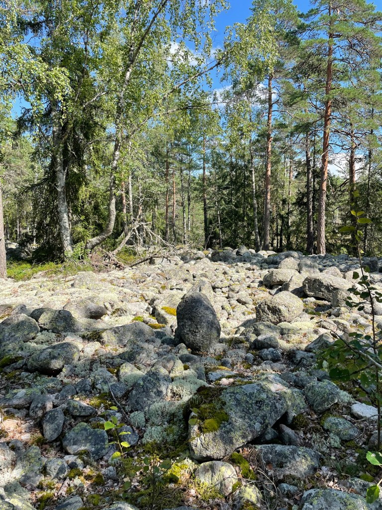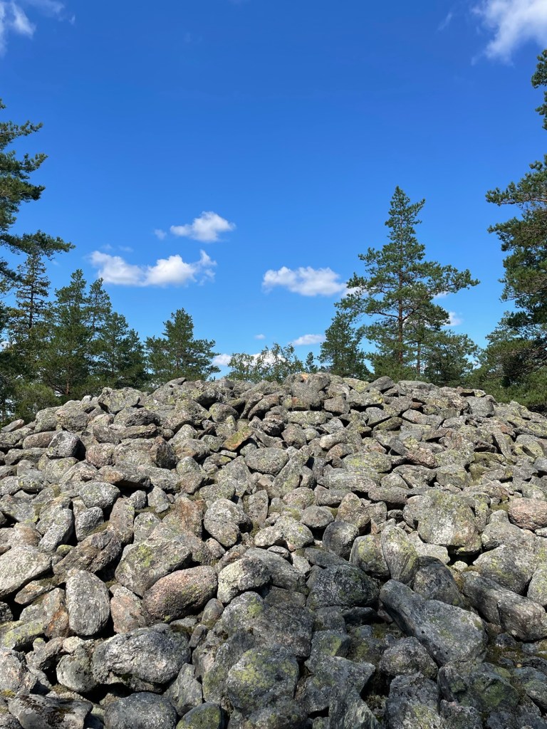Ylhäällä katselimme hetken maisemia ja tarkastelimme suuntaa. Pieni kartan tutkiskelu ja jonkunlaiset kallion kulumat veivät kuitenkin kohti hautaröykkiötä. Tuumasin ensimmäisenä ääneen, että kivet näyttävät jotenkin uusilta. Hämmästelin siis sitä, etteivät ne olleet sammaleiden peitossa vaan tuulenpieksämällä kalliolla lähes kuin puhtaaksi pestyt. Röykkiö oli iso ja sille oli aikanaan valittu hieno paikka. Vähän matkan päässä pilkotti pirunpelto, josta kivet oli röykkiöön kannettu. On siinä ollut jollakin urakkaa.