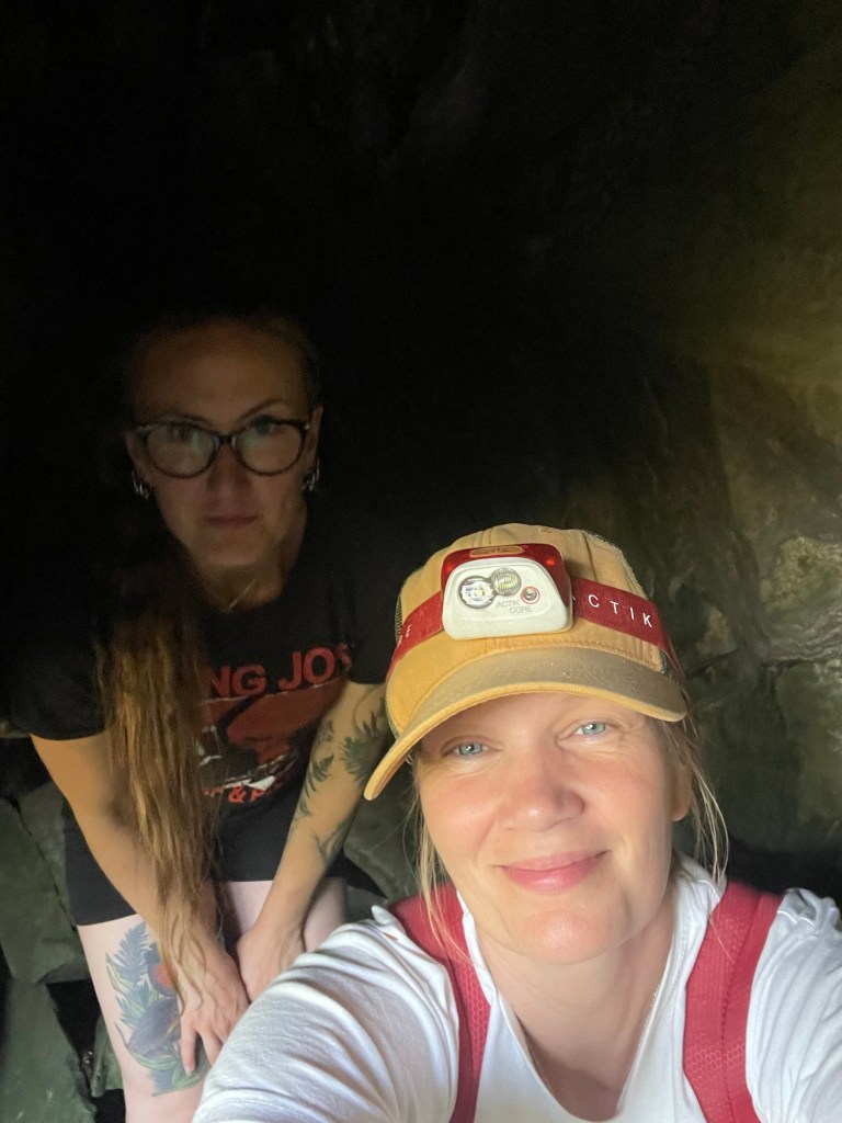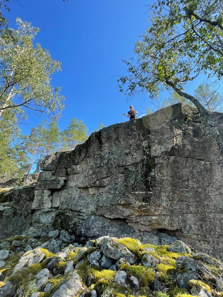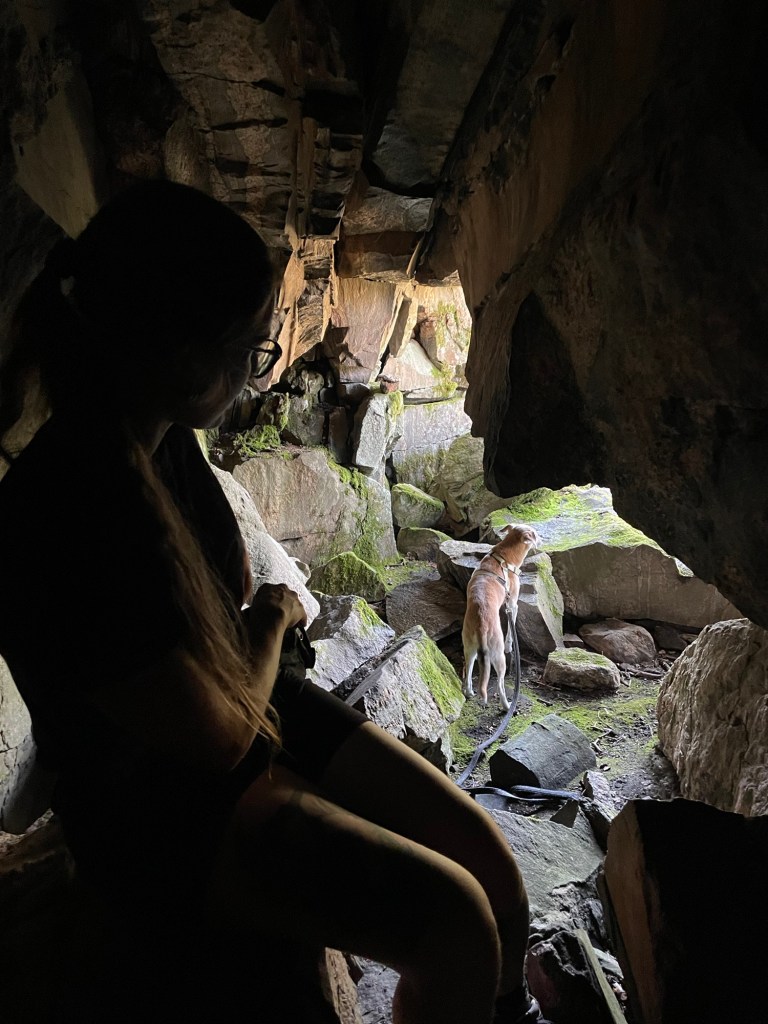 Kirjasta luin, että alueella on myös luolia, joten lähdimme etsimään niitä. Ensin löysimme lippaluolan ja kallioseinämää kiertäessä tuli vastaan varsinainen luola, jonka kattona oli iso lohkare. Siellä olisi voinut hyvin nukkua. Jatkoimme matkaa etsien kuvien perusteella pääluolan suuaukkoa, joka tulikin vastaan kallioseinämässä. Luolaan pääsi ilman mitään ryömintöjä, mutta koiran kanssa kulmikkaat pohjakivet olivat hieman hankalia. Menimme sen verran sisälle, että tutkimme luolaa otsalampun valossa. Luolan seinissä oli lukemamme mukaan kiveä nimeltä migmatiitti. En ole ihan varma, olisiko luolasta päässyt vielä edemmäs, mutta meillä ei ollut siihen sopivia varusteita, joten visiittimme jäi pääluolan suulle. Alueella oli paljonkin kallioita ja jänniä rakoja ja aukkoja tutkittavaksi, mutta me olimme nähneet toistaiseksi tarpeeksi.