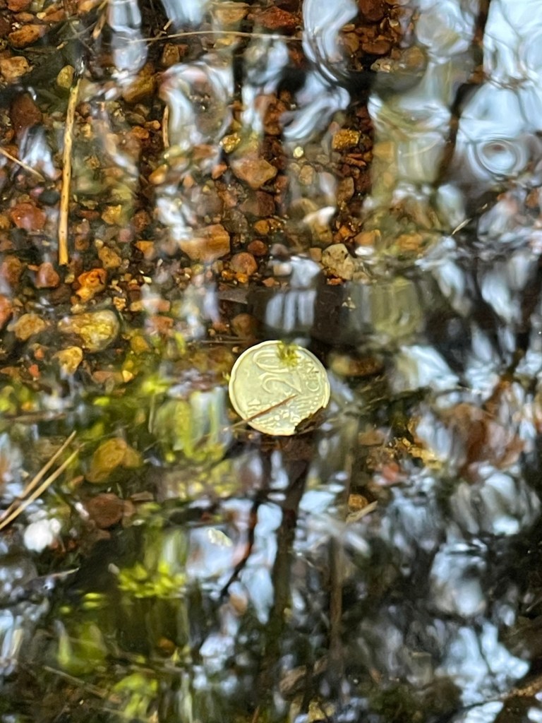 Vesi oli tietenkin äärettömän kirkasta ja raikasta. Retkiseurueestamme minä, kaverini ja koirani maistelimme vettä, eikä kukaan halaillut vessanpönttöä illalla tai seuraavana päivänä. Jotenkin uskomus siitä, että vettä voisi juoda purosta vain Lapissa, on siis kumottu. Tästä lähteestä on juotu varmaankin vuosisatoja ja ihmiset ovat uhranneet lähteelle rikkauksia ja saaneet vastalahjaksi parempaa terveyttä. Joku oli käyttänyt peräti 20 senttiä terveytensä edistämiseksi.