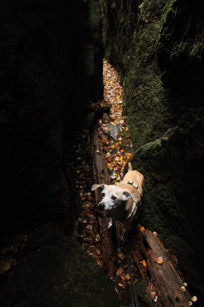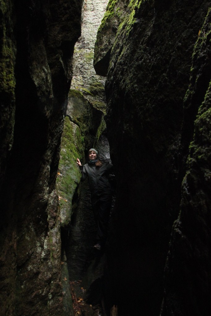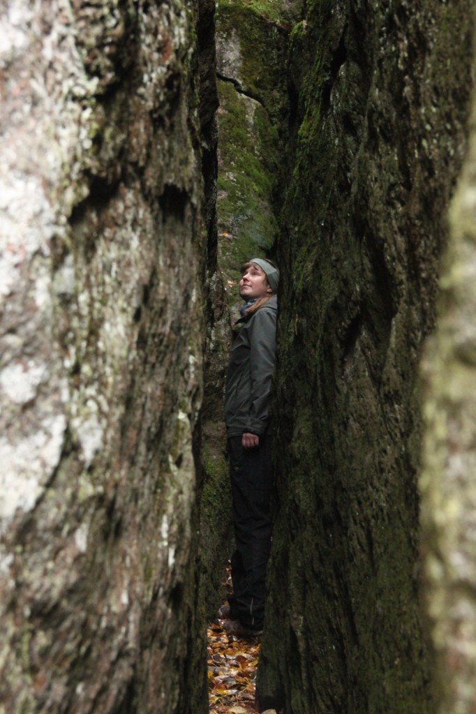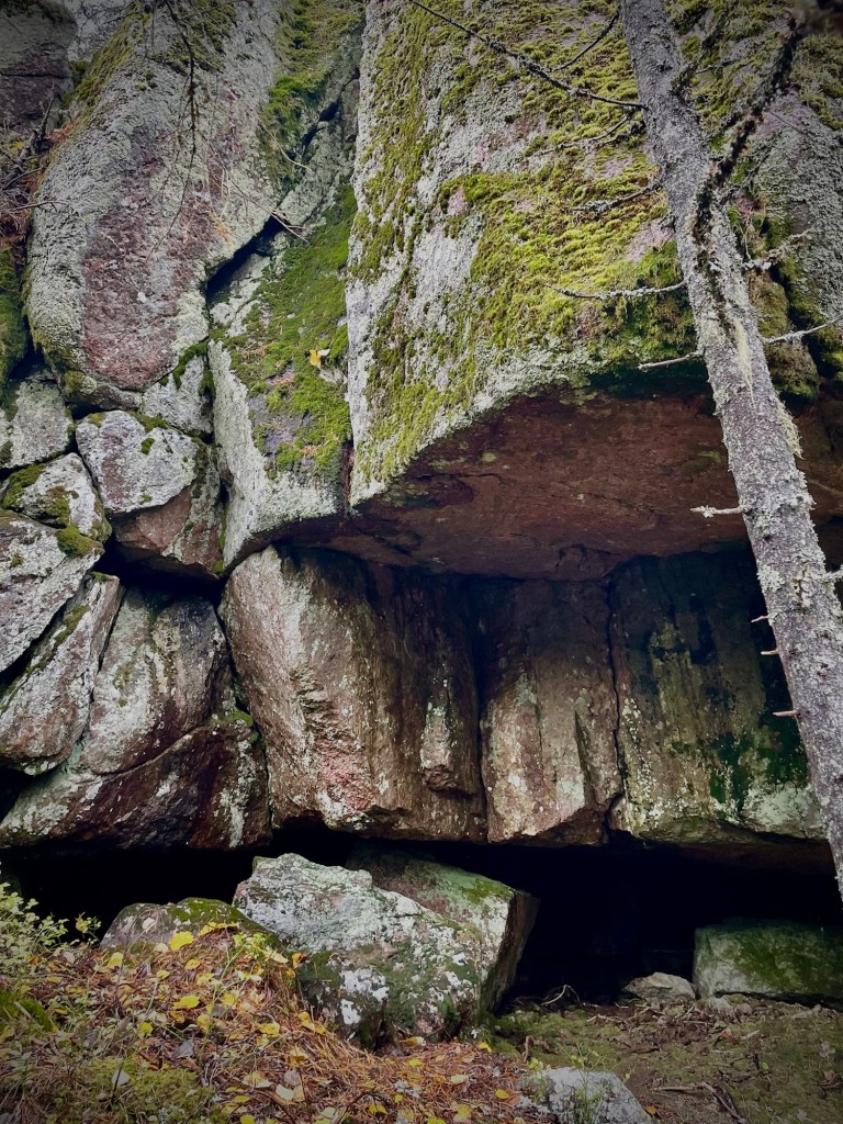 Hämmästelimme ja ihailimme kirnua joka suunnasta ja samaan aikaan havaitsin, että sen vieressä kalliossa on hieno rako- tai rotkoluola (en tiedä oikeaa termiä), jonne ehkä mahtuu kävelemään. Olin niin innoissani, etten tiennyt mitä kohdetta tutkisin ensimmäisenä. Paikalle tuli isä poikansa kanssa ja poika paineli vuorikauriin lailla ympäriinsä kaikki kolot ja kiersi koko kirnun yläkautta. Jäimme ystäväni kanssa ihailemaan sileää kirnun seinämää, joka oli kohokuvioineen kuin valtava kartta. Jäätyämme taas kahdestaan kaverini kanssa, lähdimme tutustumaan rotkoluolaan. Ensin sisään hivuttautui kaverini ja jäin koiran kanssa seuraamaan ulkopuolelle tilannetta. Kun reitti oli selvä, lähdin koiran kanssa perään. Rako on ahdas ja sivuttain menemällä kallionseinämien välissä pystyy juuri kulkemaan. Seinämät olivat ehkä noin neljä metriä korkeat ja maa oli tasaista. Rakoa pääsi etenemään ehkä noin 6-7 metriä ja perällä oli pieni komero. Fiilistelimme hienoa luonnon muodostelmaa ja kuvailimme tunnelmia, jonka jälkeen hivuttauduimme rakosesta takaisin kuolevaisten maailmaan.