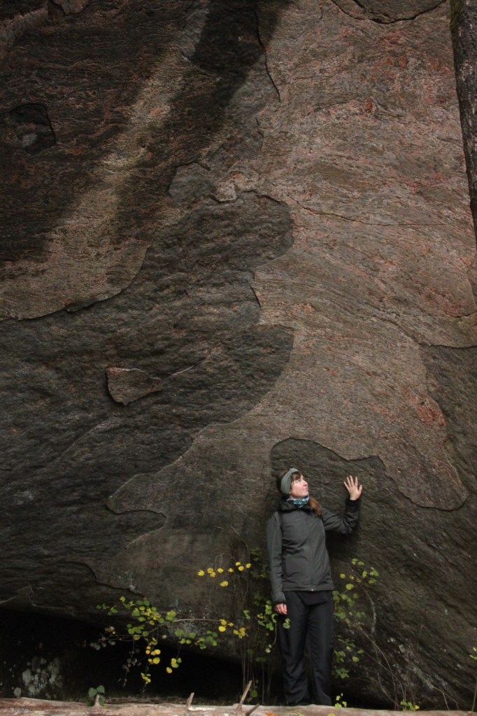 Hiidenkirnut ovat oman kokemukseni mukaan lähinnä vettä täynnä olevia kuoppia, joiden syvyydestä ja mahtavuudesta on kauhean vaikea sanoa mitään. Ruotsissa Kosterhavetin kansallispuistossa olen nähnyt rantakallioissa upeita avoimia hiidenkirnuja, jotka olivat uskomattoman sileiksi hioutuneita (joista tuli mieleen myös Högbergetin luola). Mutta Konianvuoren hiidenkirnu oli Suomen mittakaavassa mahtava näky! Ensinäkin se oli niin valtava, etten todellakaan odottanut sellaista seinämää eteeni. Toisekseen se tosiaan on seinämään muodostunut kirnu ja täten hyvin erilainen aiemmin näkemistäni kirnuista.