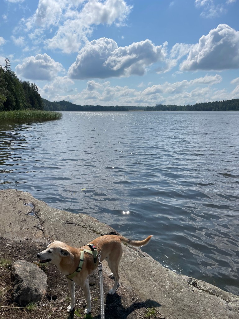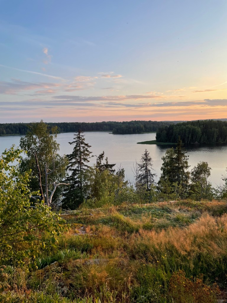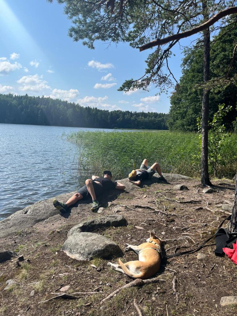 Kallioiden päälle saavuttuamme eteemme aukesikin aivan mahtavat näkymät. Alla näkyvän järven nimi on Bruksträsket ja vesistö yhdistyy Lohjanjärveen sekä Mustionjoen kautta aina merelle saakka. Vesistö olisi upea melontakohde. Aurinko kimmelsi vedessä ja mietimme, miten maisemat sijoittuvat kartalle. Kallion alemmalla hyllyllä oli painauma jonkun edellisen kävijän teltasta ja mietin, että paikka olisi kyllä tosi hieno yöpymiskohde. Istuskelimme kallioilla pitkän tovin ja mietimme, alammeko tekemään ruokaa tässä vai muualla. Päivä oli kuitenkin niin kuuma, että päätimme laskeutua alas rantaan, jossa kävi pieni tuulenvire. Reitti alaspäin on hieman vaativa ja sieltä ei huonojalkaisemmat pääse ehkäpä kauhean näppärästi alas. Polku meni keittokatoksen ohi kohti rantaa ja siellä oli täydellinen paikka täyttää vatsa ja mieli.