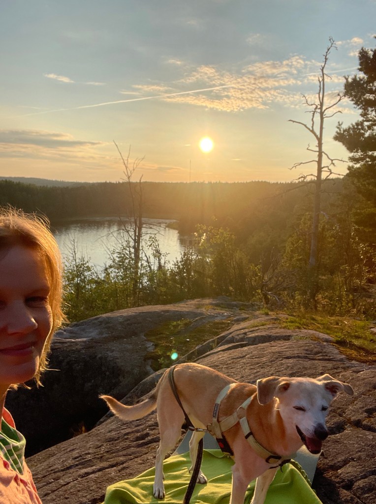 Pääruuan sekä jälkiruuan jälkeen jäimme kalliolle makoilemaan ja rentoutumaan. Kesä antoi parastaan. Vaikka itse kävelyyn ei kulunut paljon aikaa (polun pituus on alle kilometrin), oli kohde mitä parhain juuri tällaiselle rennolle käyskentelylle ja nautiskelulle. Jo paikan päällä mietin, että tänne täytyy joskus palata. Itse asiassa paluu tapahtuikin yllättävän nopeasti, sillä jo samana iltana muiden retkikohteiden jälkeen mietiskelin sopivaa yöpaikkaa autossa nukkumiseen ja koska parkkipaikka oli niin rauhallinen ja olin edelleen lähistöllä, ajoin illalla takaisin. Kiipesin koiran kanssa vielä kallion päälle ihailemaan auringonlaskua ja venyttelemään. Kesäpäivä ja -ilta olivat todellakin parhaimmillaan.