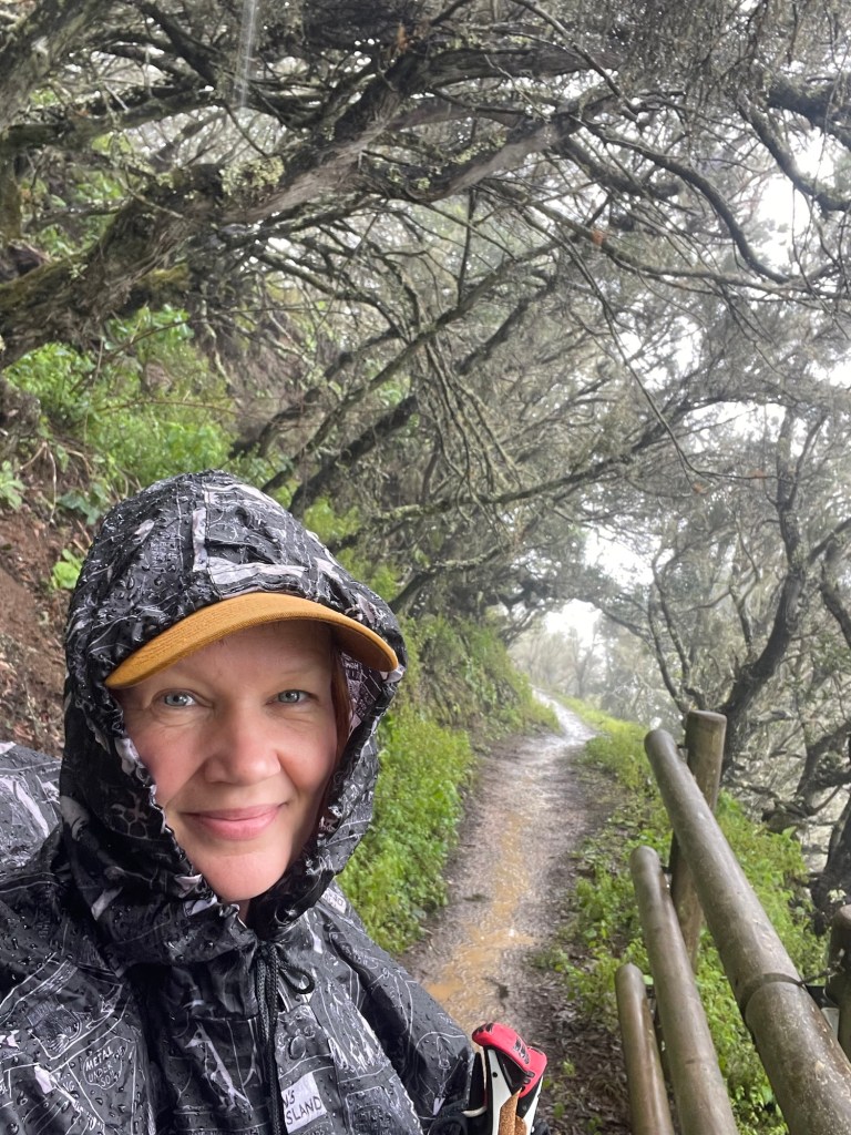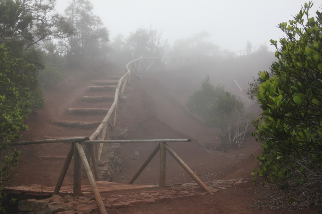 Tauon jälkeen sokkeloinen Agulo jäi taakse ja taas alkoi ylämäki. Tällä kertaa reitti vei Garajonayn kansallispuiston vierailukeskukseen (Juego de Bolas), joka olikin iso ja mielenkiintoinen paikka. Täältä olisin saanut hyvin lisää vettä, joten raahasin turhaan täydessä painossa olevan rinkan ylös. Tämä saarta kiertävä reitti ei kulje kansallispuiston läpi, hieman vain paikoin sen reunamilla, joten jos haluaa tutustua tarkemmin puistoon, on parempi valita toisia polkuja. Paikka oli kirjaimellisesti aivan pilvessä, joten minkäänlaisia maisemia ei nähnyt.