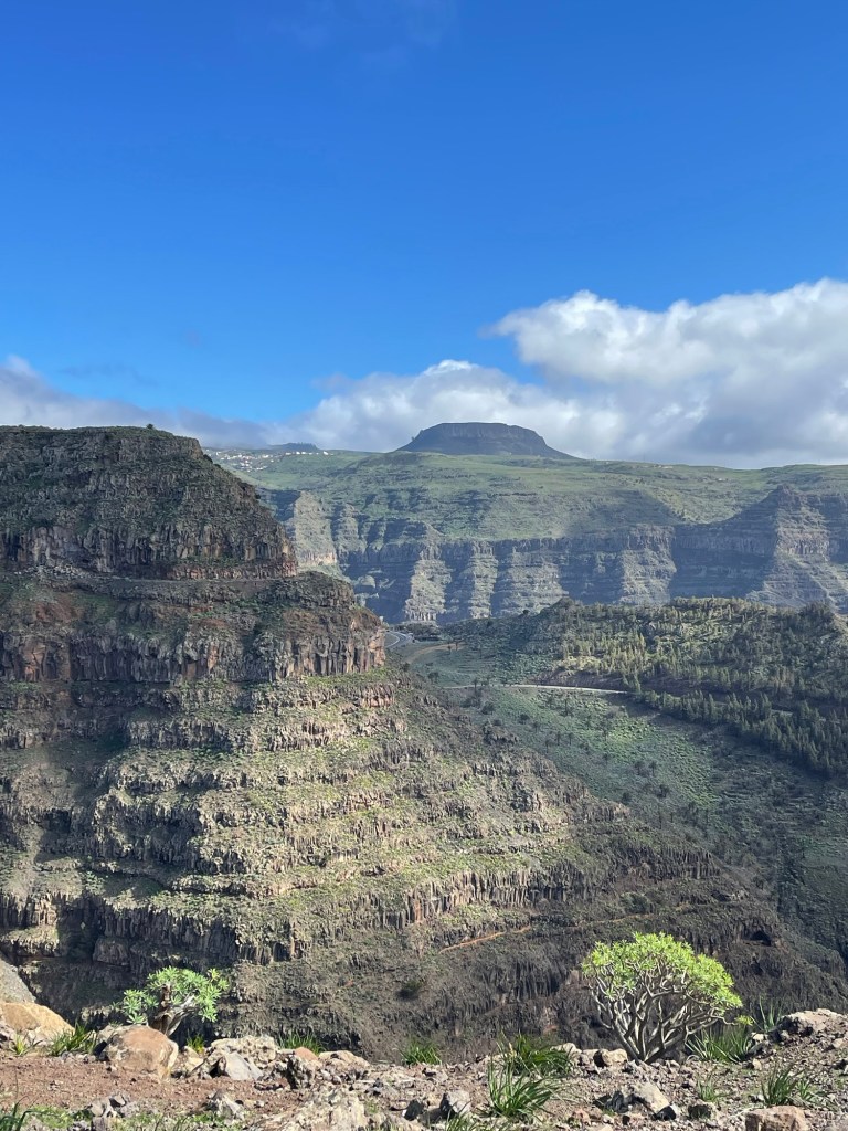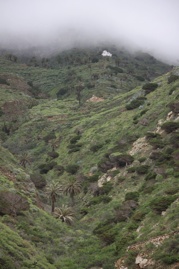 Edellisenä iltana minulla ei ollut täyttä varmuutta, mistä vaellusreitti lähtisi. Paperikartta näytti ihan eri lähtöpaikkaa, kuin AllTrails, Komoot ja muut polkusovellukset. Päätin luottaa sovelluksiin, koska niissä oli uudempaa tietoa. Onneksi luotin, sillä pitkän kaupungissa kuljetun ylämäen jälkeen näin ensimmäisen reittiviitan. Viitta löytyi Calle de la Orilla de Llano -nimisen tien päästä liikenneympyrän jälkeen. Tuulimyllyt ovat myös hyvä maamerkki. Olin lähtenyt seitsemän jälkeen aamulla matkaan, jotta pääsisin kaupungista pois ennen auringonnousua ja lisääntyvää liikennettä. Jalat tuntuivat erityisen hyviltä ja lihakseni olivat saanut ansaitun levon edellisen reitin jäljiltä. Tuuli oli taas todella navakkaa ja en yhtään ihmettele, että tälle alueelle oli laitettu tuulivoimaa. Maasto oli kuivakkaa ja polku kivikkoista. Saavuin Majonan suojelualueelle ja eroosio oli kaivertanut seinämiin erilaisia luolia ja muotoja. Okran värinen hiekka, vihreät kasvit ja paikoin vaaleat kivet tekivät maisemasta erityisen hienon. Taivaanrannassa näkyi Teneriffan Teide-tulivuori ja loputtomasti merta. Jossain vaiheessa laskeuduin korkeammalta alas hiekkatielle, jota seurattiinkin monta kilometriä loivasti ylöspäin. Olin noussut pilvien korkeudelle ja se toi maisemaan oman dramaattisen tunnelmansa. Saaren pohjoisosat ovat pilvisempää aluetta, sillä mereltä tuuli ohjaa sumusadetta ja pilviä nimenomaan etelää kohti. Sen takia saaren pohjoisosa on myös huomattavasti vehreämpi kuin eteläosa. Söin lounaan jossakin vaiheessa matkaa ja kuuntelin vuorilla liikkuvien vuohien ääniä. Tieosuus eteni reippaasti. Olin asettanut tavoitteeksi kulkea joka päivä vähintään 16 km, mutta ensimmäisenä päivänä napsin kilometrejä jopa 22.