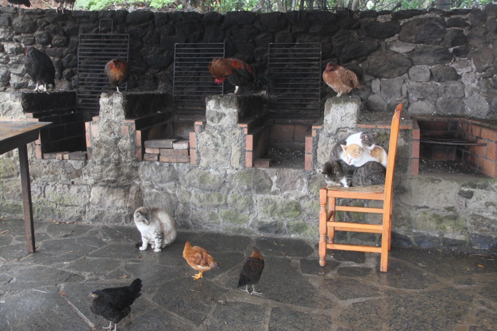 Olin sateen saapuessa aika lähellä huippua ja kivikkoinen polku muuttui pehmeäksi ja liejuiseksi tieksi. Näkyvyttä ei ollut paljoakaan ja olin kirjaimellisesti sadepilven sisällä. Olin tyytyväinen selätetystä ylämäestä ja tiedossa oli pidempi pätkä tasaisempaa kulkua. Vastaan tuli opastettuja kävelyretkiryhmiä ja ihmisten ilmeet eivät olleet tyytyväisimmästä päästä. Minua lähinnä nauratti. Joitakin kilometrejä sateessa kuljettuani aloin etsimään edes jonkunlaista katosta, joka sopisi lounaspaikaksi. Olin alkanut myös palelemaan ja kenkäni olivat litimärät ja saven kuorruttamat. Yhtäkkiä näinkin katoksen jonkunlaisella näköalapaikalla, josta ei tietenkään ollut sään puolesta mitään näkymiä sillä hetkellä. Purskahdin nauruun, kun huomasin katoksen olevan täynnä porukkaa. Ei ihmisiä, vaan kissoja, kanoja ja kukkoja. Kaikki olivat kertyneet sinne sadetta pitämään ja tuijottivat minua tyynesti kuin ilmoittaen, että me emme aio väistää. Niinpä asettelin tavarani lintujen ja kissojen väliin, söin lounaani ja lisäsin vaatteita. Paikalle saapui skotlantilaispariskunta, joiden kanssa rupattelin tovin. Kerroin heille, että olen huhtikuussa menossa Skotlantiin vaeltamaan ja en tiedä vaikuttiko se asiaan, mutta he tarjoutuivat antamaan minulle yhteensä litran vettä lisää. Niinpä minulla ei ollut vesien suhteen enää kriittistä hätää. Ilman viiletessä oli vedenkulutuksenikin paljon pienempää.