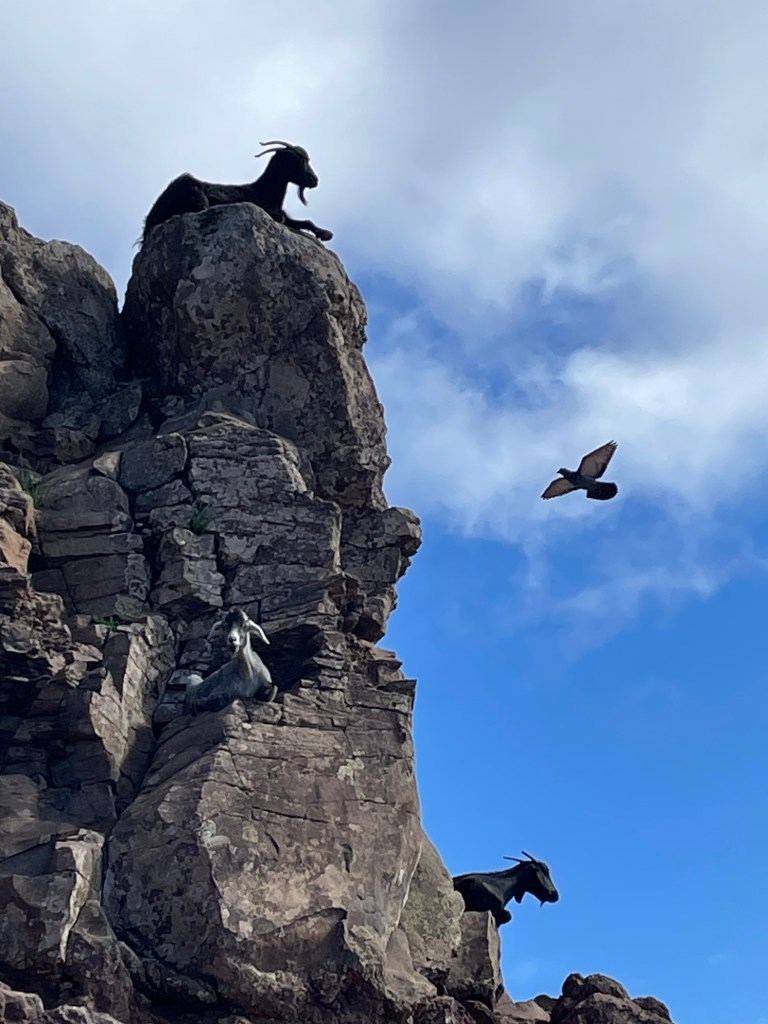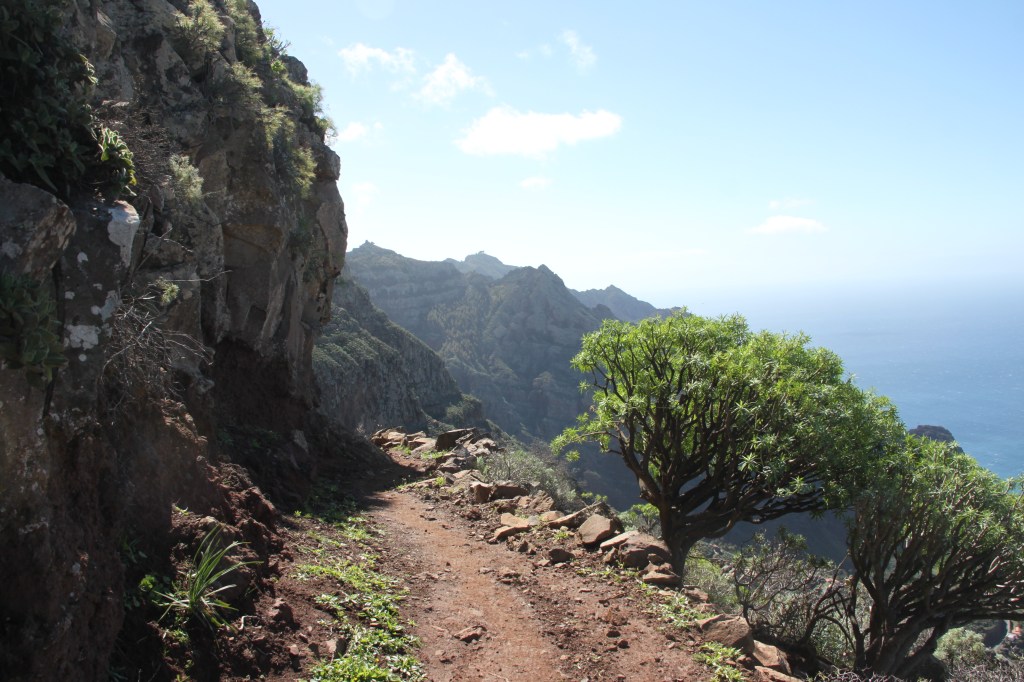 Reitti kipusi taas ylöspäin ja edessä olikin koko ympyräreitin hienoimmat maisemat. Alojerasta Arureen reitti kulkee huiman hienoissa maisemissa, korkealla rinnettä pitkin maisemien avautuessa laaksoihin ja merelle. Ylämäessä tuuli paikoin todella kovaa ja välillä jouduin seisomaan vain paikallaan kävelysauvoihin tukeutuen ja odottaen, että pahin puuska menee ohi. Reitin kiepsahtaessa tuulettomalle puolelle oli kulku melko tasaista, mutta ei ehkä korkeanpaikankammoiselle sopivaa. Täällä reitti kulki todella lähellä jyrkänteitä ja askeleisiin tuli keskityttyä entistä skarpimmin. Seurailin tuulihaukkoja ja poluilla kipittäviä vuohia, ihailin mahtavia maisemia, söin lounaan ja nautin auringosta. Jalat olivat todella kurjan tuntuiset, mutta olin ihan mahtavalla tuulella, koska tunsin olevani etuoikeutettu kulkiessani täällä ja kuitenkin kaikki muut asiat olivat todella hyvin. Kuljin hitaasti ja kuvasin paljon.