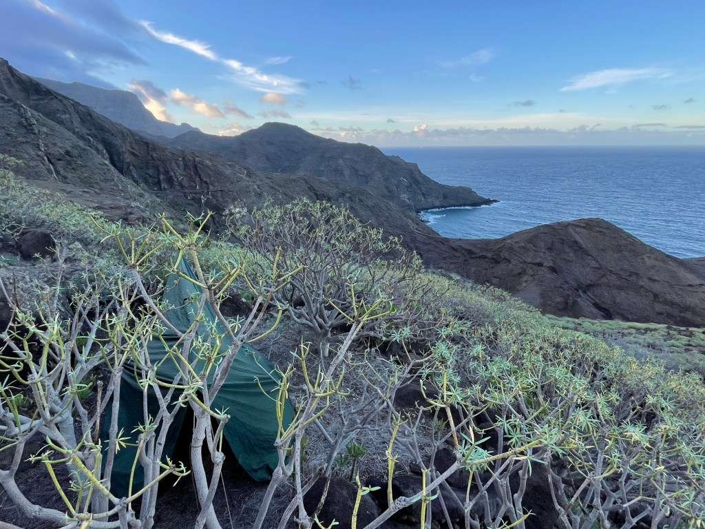 Hiekkatie nousi lakipisteessään upealle näköalapaikalle, josta avautui pohjoisrannikon maisemat. Sieltä alkoi pitkä alamäki kohti La Caletan rantaa. Ajattelin rannan olevan tuulinen ja päädyin pystyttämään telttaviritykseni ennen rantaa sijaitsevalle alueelle, joka koostui pensaista ja penkereistä. Pensaat hillitsivät jonkun verran tuulen vaikutusta. Nukuin hyvin ja puhkuin intoa.