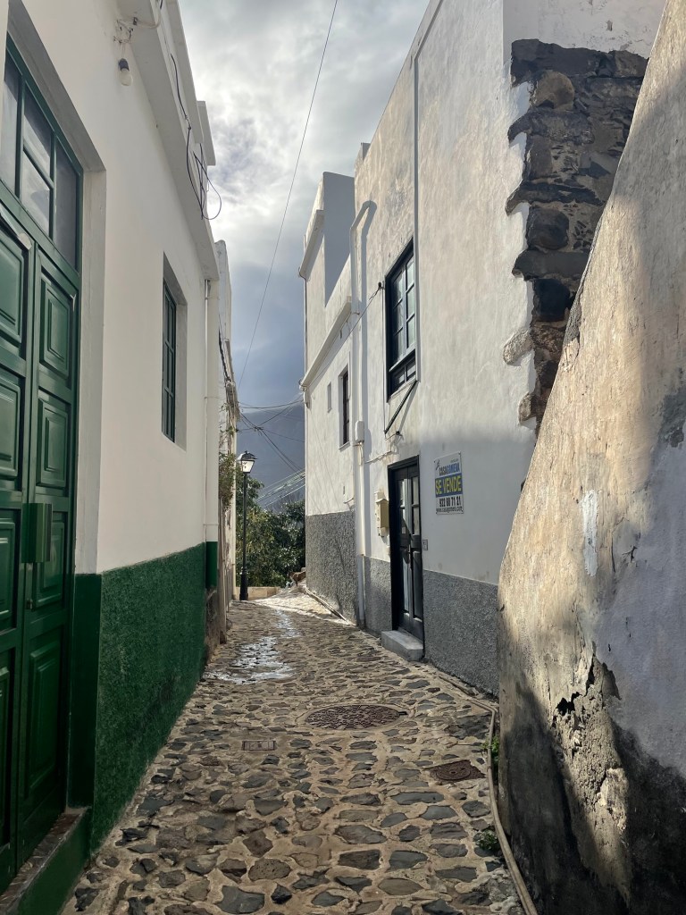 Heräsin hyvin nukkuneena ja aamupalan sekä leirin kasaamisen jälkeen lähdin taas kävelemään. Mikään ei muuten voita sitä tunnetta, kun rinkan saa nostaa selkää ja pääsee taas matkaan. Tiedossa oli taas ylä- ja alamäkeä, mitäpä muutakaan. Reitti vei Hermiguaan ja sen tuuliseen rantaan, josta jatkui ylämäki kohti Aguloa, jota on tituleerattu La Gomeran kauneimmaksi kyläksi. Olihan se kaunis, mutta huhhuh, miten jyrkkämäkinen. Hiki puski pintaan kiivetessä teitä ja penkereitä aina vaan ylemmäksi. Olin katsonut etukäteen ravintolan, josta saisin vesitäydennystä, mutta koska oli sunnuntai, paikka oli kiinni. Myös kauppa oli kiinni ja kartasta löysin jostain kauempaa avoinna olevan minimarketin, mutta se tuntui olevan siinä hetkessä liian kaukana. Istuin varjossa syömässä energiapatukkaa ja tankkasin viimeisiä vesiä. Samaan paikkaan putkahti belgialainen isä kahden tyttärensä kanssa, jotka olivat myös vaeltamassa saarella. He päättivät kysyä vettä joltain paikalliselta auki olevan ikkunan kautta. Liityin mukaan ikkunakioskiin ja ystävällinen asukas täydensi vesivarastomme. Join siis koko La Gomeralla oloaikani vesijohtovettä, vaikka se maistuu vähän hassulle. Se on siis täysin käyttökelpoista, mutta paikalliset ja turistit käyttävät juomiseen pullovettä paremman maun takia.