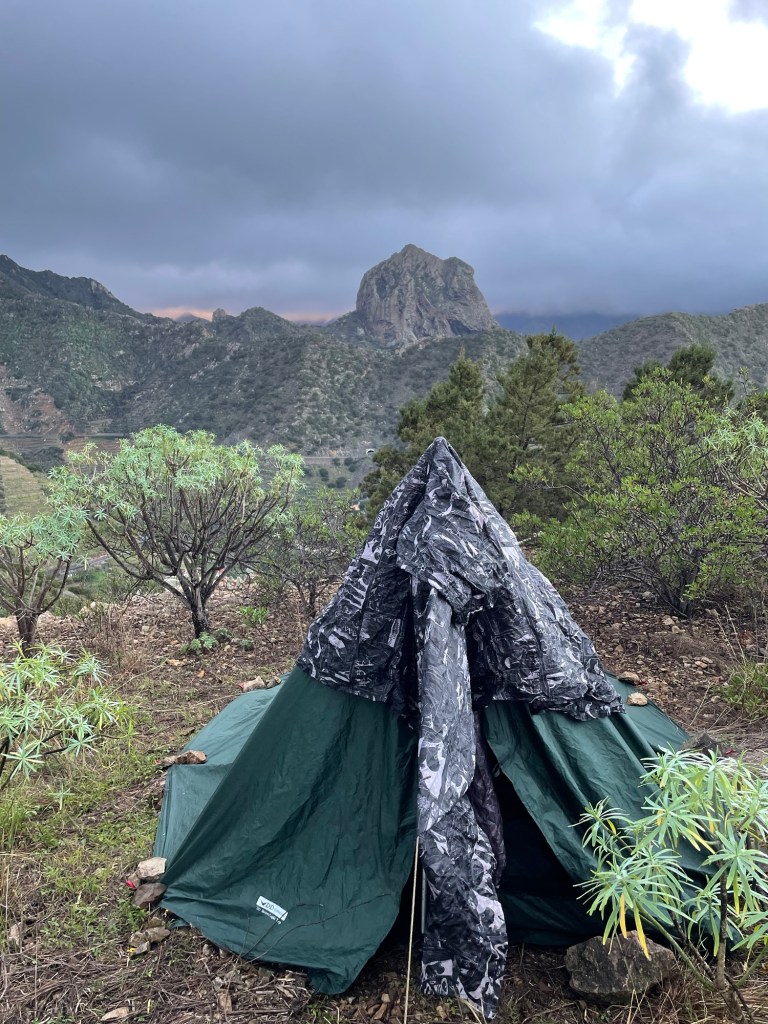 Ainoat pakolliset tehtävät päivässä olivat veden täydentäminen ja kohtuullisen leiripaikan löytäminen. Reitti on suunniteltu siten, että sen pystyisi kulkemaan myös majoituksesta majoitukseen päivärepun kanssa. Mitään Bed and Breakfast -tarjontaa en kylissä nähnyt, joten jos tähän tapaan turvautuu, täytyy hyvissä ajoin varata majoitukset netin kautta. Leiripaikkojen löytäminen oli paikoin aika haastavaa, mutta kulkiessa oppi jo ennakoimaan korkeuskäyriä ja katsomaan kartasta sopivalta näyttäviä tasaisempia paikkoja. Telttailu on Kanariansaarilla kielletty, mutta se on siedettyä. Kiellolla on haluttu estää mahdolliset siirtolaisten, asunnottomien tai kiertolaisten pystyttämät telttaleirit. Vaeltajien kesken etikettinä oli se, että leiri laitetaan pystyyn hämärän tullen ja puretaan leiri heti aamunkoitossa, eikä jätetä jälkeen minkäänlaista roskaa.
