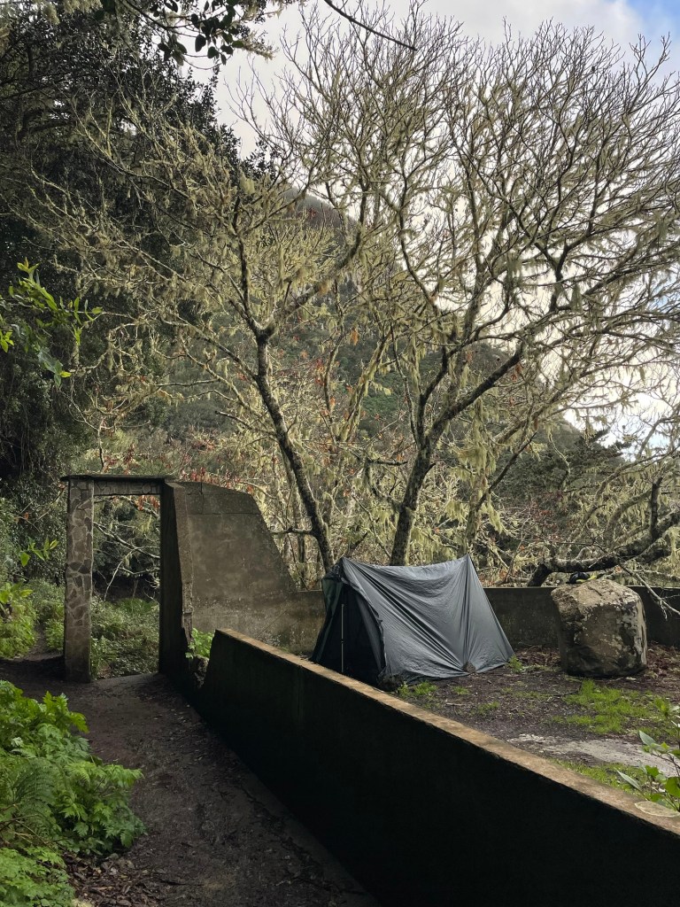 Oma reittini kulkisi Vallehermoson rannan kautta, mutta tiesin, etten saavuta sitä ennen pimeää, joten aloin etsimään leiripaikkaa. Lupaavan oloinen tasanne löytyikin sopivasti, mutta sinne täytyi mennä pensaikoiden läpi. Piikkikasvin köynnös upposi reiteeni ja jouduin varovasti irroittamaan köynnöksen verta vuotavista pistohaavoista. Selvitin tieni pienelle tasanteelle ja putsasin haavat. Samaan aikaan alkoi yhtäkkiä vesisade ja heitin maavaatteen kamojen päälle ja itseni suojasin sadeviitalla. Puhelimessa ei ollut kenttää, joten ensimmäistä kertaa käytin GPS-laitettani. Laitoin vanhemmille tiedoksi leiripaikkani ja tilasin sääennustuksen. Ennustus näytti pelkkää aurinkoa ja kuuron mentyä ohi pystytin teltan ja juuri kun olin saanut sen kasaan, alkoi satamaan uudestaan. Yöllä sateli pariin otteeseen ja tuuli paukutti tarppikangasta, mutta nukuin ihan hyvin.