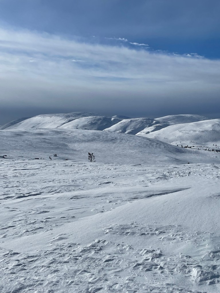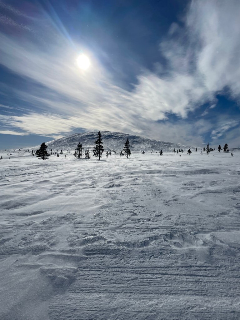 Suhteellisen hyvin nukutun yön jälkeen ja rutiininomaisten aamutoimien jälkeen pääsin matkaan kello 10. Tästä päivästä tulikin yksi vaelluksen ikimuistoisimmista. Reitti nousi heti tunturiin ja maisemat olivat kertakaikkisen mahtavat. Tuuli oli kova, noin 21 m/s, mutta onneksi se puhalsi takaapäin. Joissakin kohdissa jouduin sivutuuleen ja se horjutti menoa. Irtolumi kulki tuulen mukana upeasti hangen pintaa pitkin ja jäin kuvailemaan maisemia, vaikka tuuli meinasi jäädyttää näpit. Lämpötila oli lähellä nollaa ja aurinko paistoi täydeltä terältä. Tunsin kulkevani kuun pinnalla tai jossakin ihan toisessa maailmassa. Olin aivan järjettömän onnellinen ja rakastin sitä tuulta, joka antoi näytteitä luonnon voimasta. Tuuli tuntui vievän mukanaan kaiken, mikä ikinä oli mieltä joskus painanutkin.