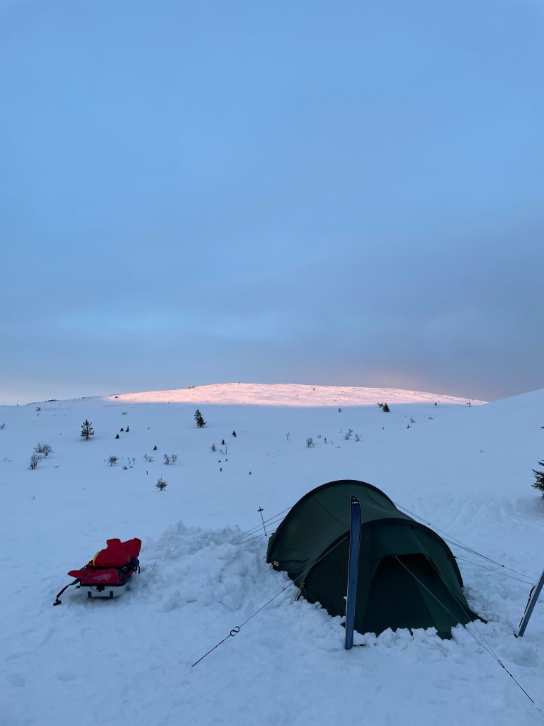 Heti ensimmäisissä alamäissä olin yllättynyt siitä, miten mukavasti uusi Fjellpulkenin ahkio pysyi takanani. Koulussa olimme käyttäneet Paljakan ahkioita ja ne änkesivät pienissäkin alamäissä ohi. Paljakoissa aisat menevät ristiin, joka helpottaa kyllä ahkion ohjailua esimerkiksi metsämaastossa, mutta suorat aisat olivat todella paljon käytännöllisempi ratkaisu tunturissa. Fjellpulken ei myöskään kaatunut reissun aikana kertaakaan.