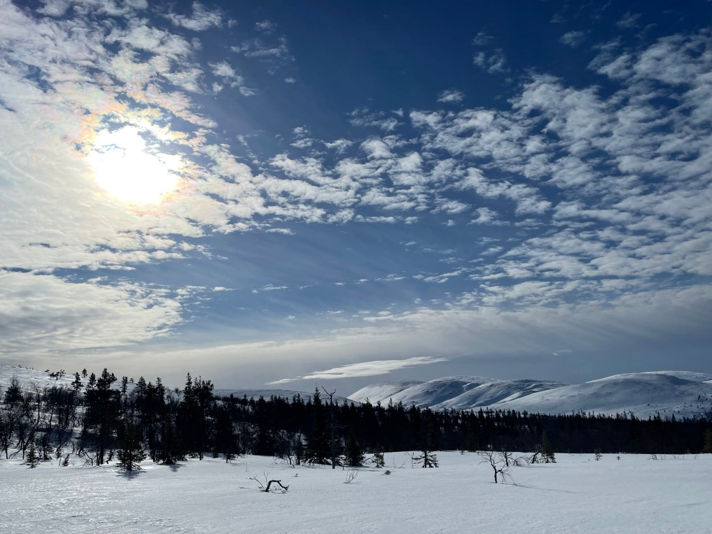 Sioskurulla söin melko pikaisen lounaan ja jatkoin matkaa Hannukurulle. Nyt haaveet saunomisesta olivat heränneet. Hiihdellessäni minua ei yhtään haitannut saman reitin kulkeminen uudestaan, sillä pääsin vielä kerran noihin upeisiin tunturimaisemiin. Tämä pätkä on mielestäni ehdottomasti reitin paras osuus. Täällä on myös vähemmän päivähiihtelijöitä ja harvat vastaantulijat ovat vaeltajia.