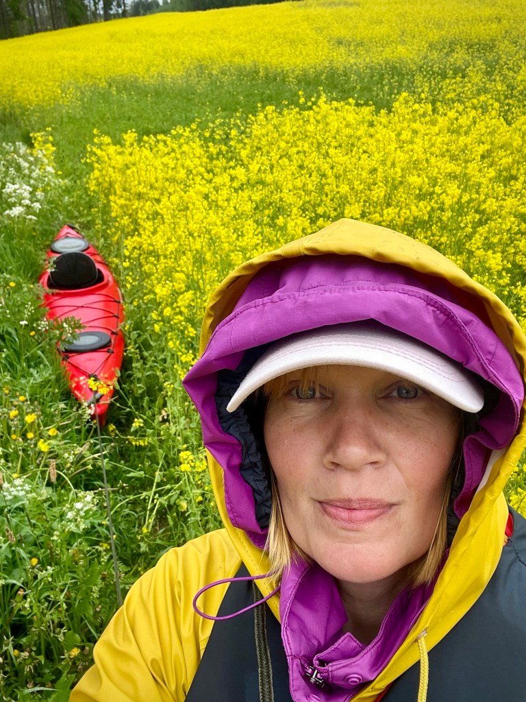 Jouduin hetken etsimään sopivaa rantautumispaikkaa. Oikealla puolella oli asutusta ja ainut vaihtoehto olisi kulkea vasemman rannan kautta. Rannassa oli metsäkaistale, joka nousi jyrkästi ylös pellon reunaan. Lähdin tavaroiden kanssa kartoittamaan reittiä ja koskiosuus olikin yllättävän pitkä. Kuljin kauniin keltaisen rypsipellon reunaa ja tutkin samalla Karttaselaimesta kosken kulkua ja päättelin, missä kohtaa suunnilleen voisin poiketa alas rantaan. Jyrkkä rinne metsän läpi vei heinikkoiseen rantaan, josta pääsisin jatkamaan matkaani. Kaaduin muutaman kerran tavaroiden kanssa rähmälleni ja se ei lisännyt millään tavalla intoani touhuun. Oli taas urheilusuorituksen aika. Nyt päädyin vetämään kajakkia lähes koko matkan ja se oli nopeampaa kuin kantaminen. Oli vain todella raskasta saada se jyrkkää rinnettä ylös pellon reunaan. Rypsipellolla alkoi touhu jo vähän naurattamaan. Vetäessäni kajakkia rinnettä taas alas, jouduin väistelemään sitä, koska se tuli niin vauhdilla päälle.