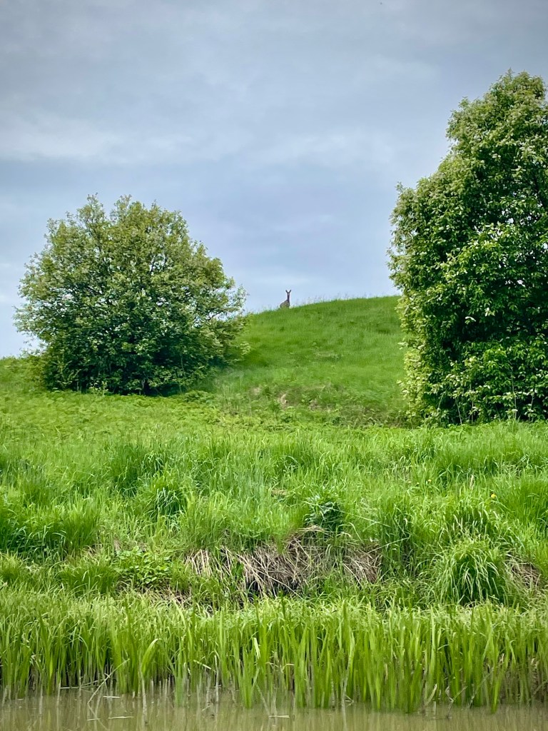 Sade ei yltynyt missään vaiheessa kauhean kovaksi. Aukkopeiton alla jalat tuntuivat lämpimältä, vaikka housut ja kengät olivatkin litimärät. Sadetakki päällä sade ei juuri haitannut. Onneksi tuuli oli tyyntynyt eiliseltä ja eteneminen oli sen suhteen helppoa. Käsivarteni olivat väsyneet ja meloin tasaisen rauhallista tahtia eteenpäin. Maisemat olivat niittypenkereitä pienillä metsäosuuksilla. Paikoin pelloilta kantautui sianulosteen haju, joka ei tehnyt joen vedestä yhtään houkuttelevampaa.