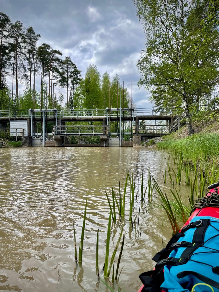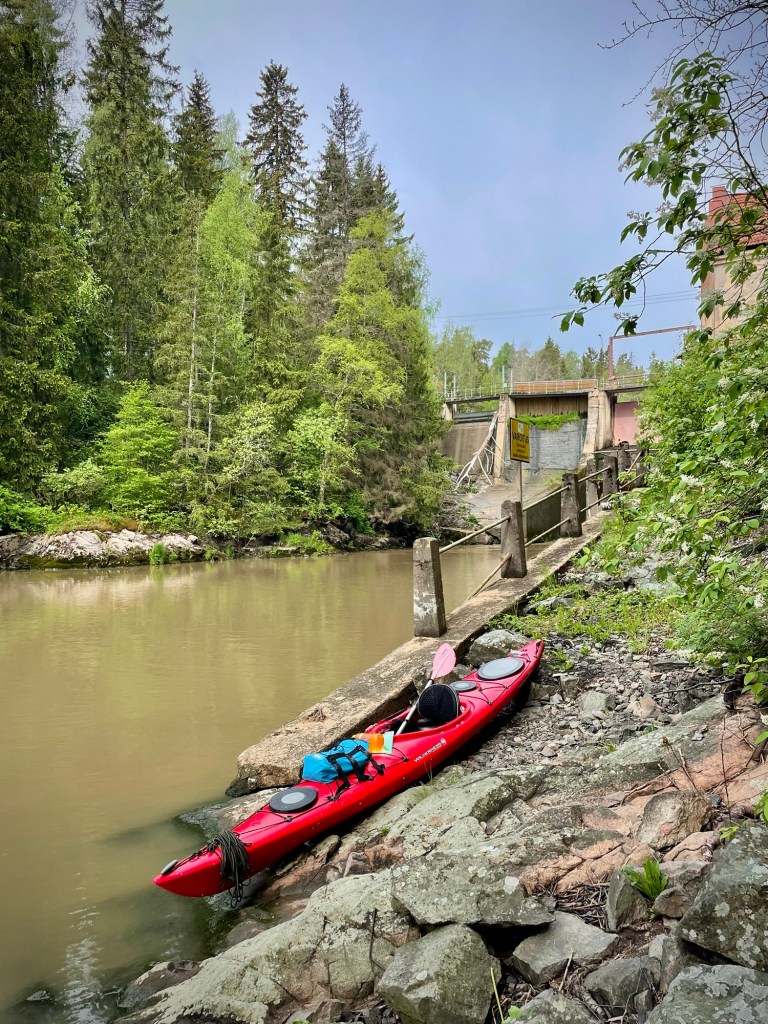 Rantauduin ennen patoa sillan alle oikealle puolelle. Siinä oli puinen tasanne, mutta se oli niin korkea, ettei siihen pystynyt kajakista käsin nousemaan, joten ainut vaihtoehto oli nousta jyrkälle penkereelle. Purin kajakin nyssäkät kantokasseihin ja vedin tyhjän kajakin korkeammalle vedestä. Lähdin kiikuttamaan tavaroita edeltä ja samalla tarkistamaan reittiä. Sillan alta johti ylös jyrkät puiset rappuset, joita pitkin pääsi tielle. Tietä pitkin piti edetä noin 50 metriä ja sitten olikin viitta vasemmalle uimarannan merkiksi. Reitti laskeutui alas rantaan, joka on parhaat päivänsä nähnyt jo aikapäiviä sitten. Jätin tavarat sekä melan rannalle ja lähdin hakemaan kajakkia. Kävellessäni takaisin kajakin luokse alkoivat mieleen hiipiä epäilykset, että miten mahtaisin saada kajakin ylös padolta ja kannettua sitä koko matkan rantaan. Kajakkini painaa noin 20 kiloa, joka ei kuulosta paljolta, mutta muoto tekee siitä hankalan kannettavan. Edellisillä melontavaelluksillani olimme käyttäneet apuna siirtämiseen tarkoitettua kärryä, joka oli valmiiksi rannassa ja muutenkin porukassa vesipelien siirto oli huomattavasti helpompaa. Nyt olin kuitenkin yksin ja jollain ihmeen ilveellä kajakki oli saatava siirtymään eteenpäin. Nappasin kajakin olkapäälle ja tuntuivatpa aukon reunat ikävän teräviltä olkapäässä ja kyljessä. Tutisten nousin jyrkät rappuset ylös ja hivutin kajakkia portaiden mutkissa varovasti eteenpäin. Tielle noustessa piti ylittää kaide ja sitten hoipertelin kajakki olalla tien reunaa pitkin. Olisin paiskannut kajakin maahan jo aiemmin, ellei tiellä olisi ollut muita liikkujia. Hammasta purren menin katseilta piiloon ja heivasin kajakin heti puskien takana maahan. Pyyhin hikeä ja samalla mietin, että olinko tehnyt karmean virheen lähtiessäni tälle reissulle yksin. Edessä olisi monta ohituspaikkaa ja en ollut yhtään huomioinut, miten raskasta kajakin kantaminen oikeasti oli. Oppi tuli nyt kantapään kautta.