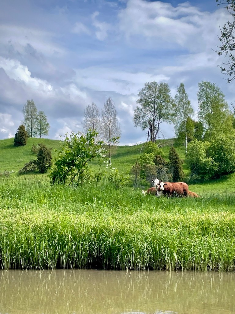 Patakosken jälkeinen jokipätkä oli mielestäni todella kaunis, yksi reitin parhaista. Mökkejä ei näkynyt, vaan sai meloa metsän siimeksessä täysin luonnon keskellä. Matka taittui muuten mukavasti, mutta tuuli oli todella kova ja sen osuessa joelle joutui melomaan voimalla eteenpäin. Jossain vaiheessa maisemat muuttuivat taas aukeammiksi. Rannassa näin ihan pienen bambin emonsa kanssa ja se ilahdutti suuresti.