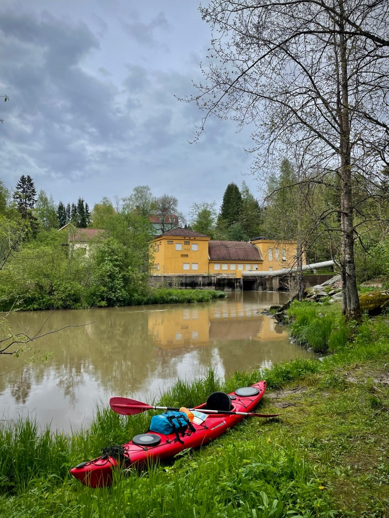 Saavuttuani Askalan voimalaitokselle oli edessä pidempi siirtymä. Lähdin kantamaan tavaroitani tietä pitkin ja ihastelin keltaista voimalaitosrakennusta. Täällä oli myös pieni suojeltu alue, jossa kulki lyhyt ketopolku. Lähdinkin tutustumaan polkuun, joka oli mukavaa vaihtelua kajakin raahaamiselle. Riippusillan toisella puolen oli söpö Metsähallituksen omistama punainen talo, jonka pihapiirissä oli nuotiopaikkoja. Omenapuut kukkivat, voikukat loistivat keltaisina ja näky oli kuin postikortti Suomen suvesta. Kuljin ketoalueen läpi ja pienen metsikön jälkeen saavuin takaisin rantautumispaikalle. Sitten taas kajakki olalle. Huomasin pystyväni kantamaan sitä yhä pidempiä matkoja ja varsinkin tietä pitkin käveleminen oli mukavan helppoa verraten pusikoissa rymyämiselle. Pidin voimalaitoksen luona lounastauon ja juttelin muutaman retkeilijän kanssa. Padon takana oli aika voimakas virtaus, joten jouduin suunnittelemaan melanvetoni jo etukäteen, etten joutuisi poikittain virtaan. Siirtyminen sujui kuitenkin hyvin ja matka jatkui kohti Orellinkoskea. Virtaus oli Askalan voimalaitoksen jälkeen huomattavaa ja muutamissa paikoissa jännitti, onko pinnan alla kiviä. Orellinkoski puolestaan yllätti, sillä minun ei tarvinnut rantutua, vaan pääsin laskemaan sen kohtuullisen hyvin. Matkalle osui kuitenkin virtapaikkoja, jotka olivat epämiellyttäviä kivien kolahdellessa kajakkiini. Yksi virtapaikoista oli sen verran kivikkoinen, että päätin uittaa kajakin sen ohi.