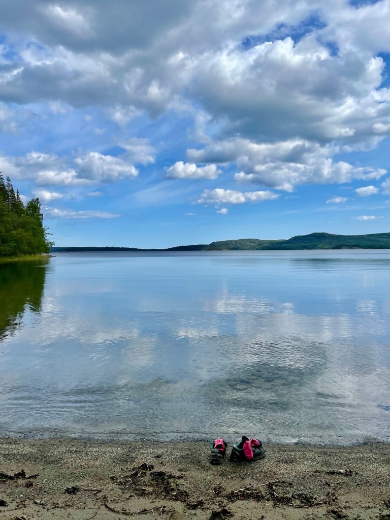 Tärnättvattnenin rannalla olisi ollut myös hieno leiripaikka ja alunperin olin ajatellut kulkea sinne saakka yöksi. Tajusin kuitenkin, etten olisi edellisenä iltana ikinä selvinnyt reitin kivikoista kipeillä jaloillani. Reitti jatkui pitkoksia ja kivikoita pitkin kauniin suon ohi, jonka jälkeen polku alkoi laskeutumaan Salsvikenin rantaan. Tällä hiekkarannalla pidin evästauon ja motivoin itseäni seuraaviin etappeihin. Kansallispuisto oli upea, mutta se oli vienyt vaikean maaston takia paljon aikaa.