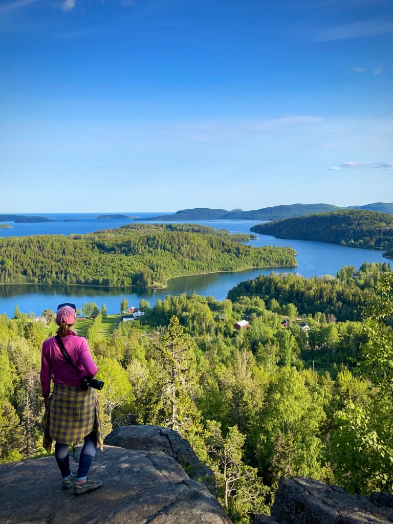 Tätä näköalapaikkaa ei mitenkään mainostettu virallisessa reittioppaassa. Jätin rinkan polun alkupäähän ja oli mukava hetken aikaa liikkua vapaasti ilman kantamusta. Polku vaati paikoin vähän nelivetoa ja kallioiden päällä polku tuntui yllättävänkin pitkältä. Ehdin jo katua päätöstäni, sillä aikaa kului ja minun olisi kuitenkin käveltävä päivän aikana 25 kilometriä, jotta pysyisin tavoitteessani. Huipulle päästyäni katumus kuitenkin unohtui, sillä maisemat palkitsivat kulkijaa. Taas kerran oli pakko pysähtyä pidemmäksi aikaa vain istuskelemaan ja nauttimaan alla levittäytyvästä ruotsimaisemasta. Samalta näköalapaikalta erottui myös aiempi näköalapaikka, jonka olin jättänyt välistä, joten tyytyväisenä mietin, että näen samat näkymät nyt samalla kertaa myös täältä. Kauheintahan olisi missata jotain erityisen hienoa!