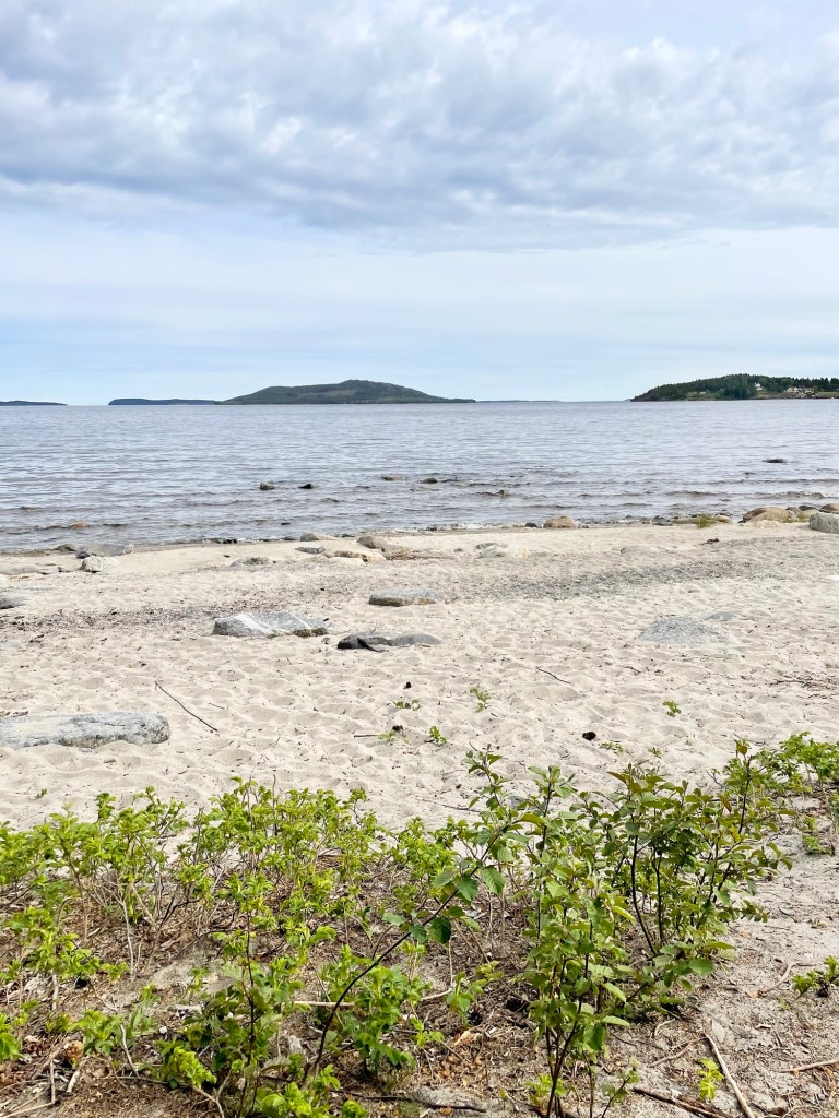 Tavoitteenani oli aloittaa päivä ajoissa, mutta kello oli jo melkein kymmenen, ennen kuin pääsin taas matkaan. Palasin pienen matkan polkujen risteykseen ja mietin, haluanko lähteä kipuamaan näköalapaikalle. Skippasin sen ja hetken kuluttua tarjoutui mahdollisuus poiketa lähellä sijaitsevalle hiekkarannalle. En oikein edes tiedä, miksi halusin sinne mennä, tarvetta millekään tauolle ei vielä ollut ja siitä tulisi ylimääräinen lenkki. Poikkesin kuitenkin varsinaiselta reitiltä, kävelin rannalle, joka oli leirintäalueen hiekkaranta, katselin rantaa ja lähdin pois. Aivan turha poikkeama ja huomasin sen herättävän itsessäni ärtymystä. Palasin reitille ja varsinaisen reitin varrella olisi ollut toinen näköalapaikka, Hålsängsberget. Halusin kiivetä edes jollekin kukkulalle ja niinpä palasin varsinaista reittiä takaisinpäin, jotta pääsisin näköalapaikalle vievälle polulle.