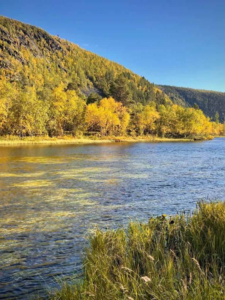 Maisemien ilotulitusta riitti myös täällä alhaalla. Ihania järvi- ja jokimaisemia, joita koristivat kanjonin jylhät seinät. Aikamme kuljettuamme vastaan tuli Beahcelávojávrritin leiripaikka, joka vaikutti oikein viehättävältä. Juttelimme hetken siellä leiriytyvän porukan kanssa ja hieman vastahakoisesti jatkoimme matkaa, sillä tavoitteenamme oli edetä hieman pidempi päivämatka.