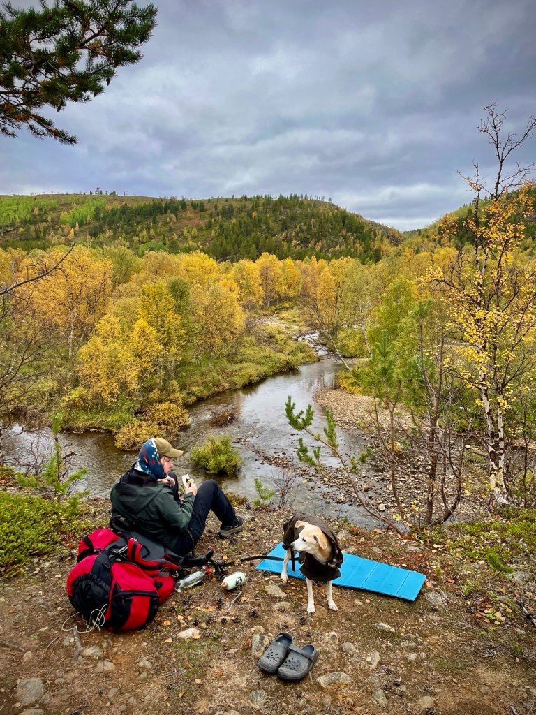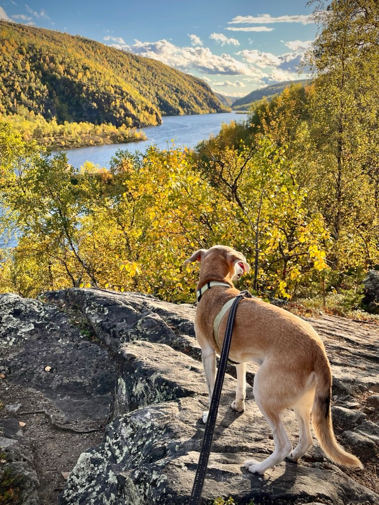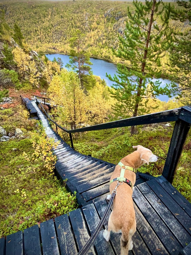 Keräsin muutamia ajatuksia koiran kanssa Kevolla vaeltamisesta Kuivin reitistä kirjoitettuun postaukseen ja ne pätevät hyvin myös tähän reittiin. Mieti, miten saat koirasi vesistöjen yli. Tarkkaile anturoita ja varaudu tossuilla tai tassuvahalla. Myös kallioinen kohta, jossa joudut suunnasta riippuen laskeutumaan tai nousemaan muutamaa kallioon hakattua rautaista askelmaa pitkin, on erittäin haastava, jos olet vaeltamassa koiran kanssa yksin.